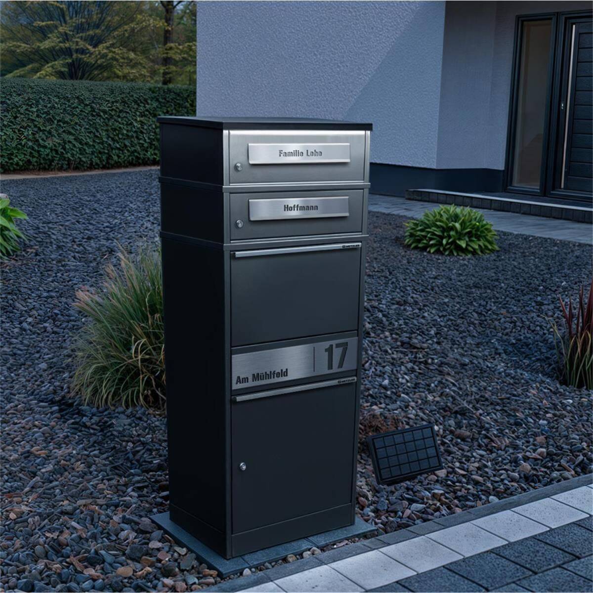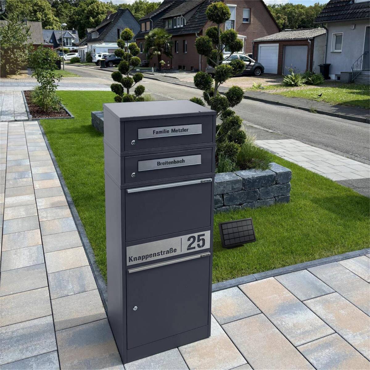 Der Briefkasten und die Paketbox in einem bieten die ideale Lösung für kontaktlosen Brief- und Paketsendungen rund um die Uhr. Mit großzügigem Fassungsvermögen können auch mehrere Pakete gleichzeitig aufgenommen werden, wodurch lästige Fahrten zur Packstation entfallen. Besonders geeignet dank der zwei separaten Brieffächer ist diese Paketbox für Generationenhäuser, Doppelhaushälften oder Reihenhäuser. Ihre Adresse und Namen werden präzise aus rostfreien Edelstahlplatten ausgeschnitten und erzeugen in Kombination mit der pulverbeschichteten, anthrazitfarbenen Box einen stilvollen 3D-Effekt. Dank des optionalen, flexibel montierbaren Solarpanels ist die Paketbox beleuchtet und sorgt auch bei Dunkelheit für eine einfache Paketzustellung.
