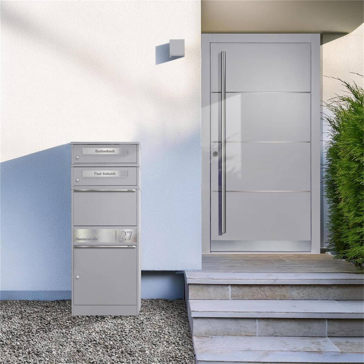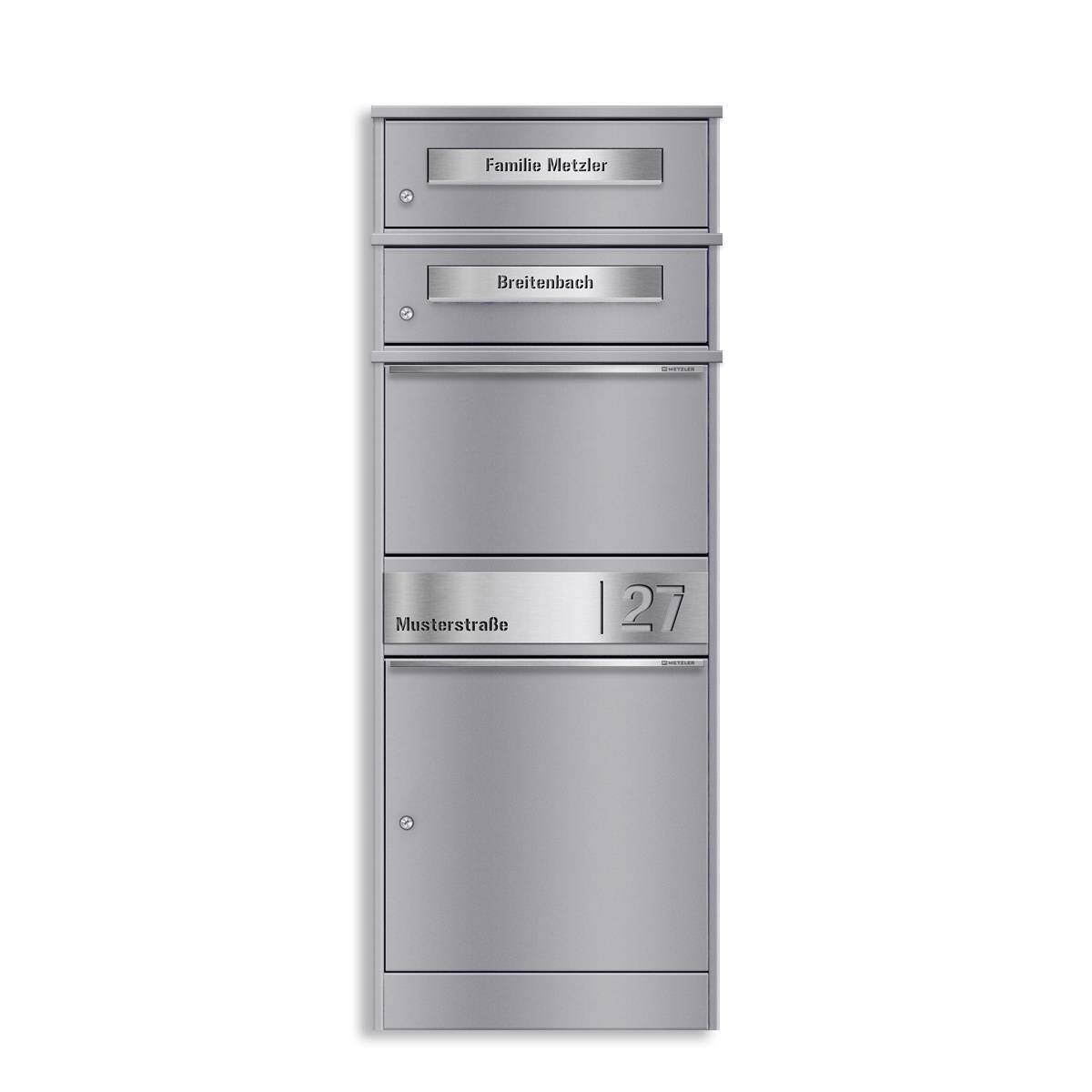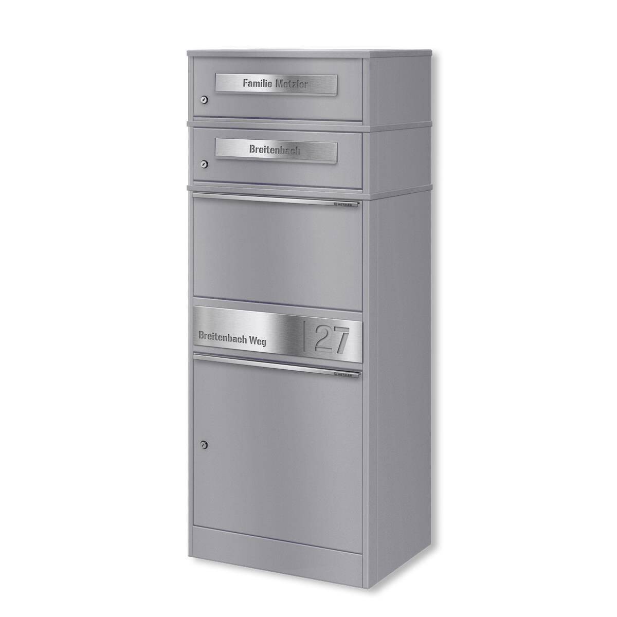 Metzler Briefkasten und Paketbox mit zwei Brieffächern, in Graualuminium, Modell Bispo 2 mit Personalisierung