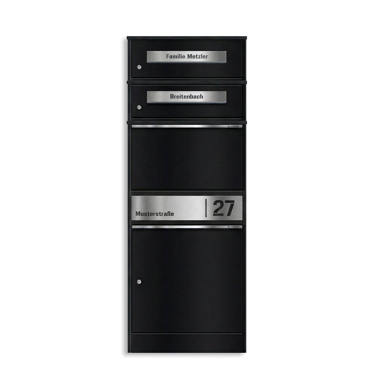 Metzler Briefkasten und Paketbox mit zwei Brieffächern, rostfrei und massiv, Modell Bispo 2 mit Personalisierung