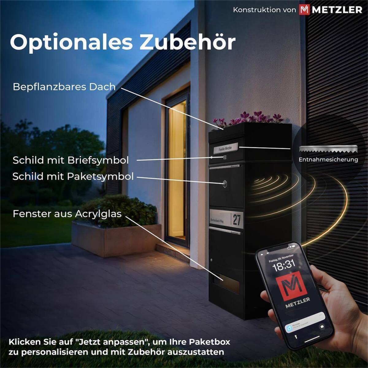 Aus den Edelstahlplatten werden Ihre Adresse und die Namen hochpräzise ausgeschnitten, sodass für beide Fächer ein individuelles Namensschild entsteht. Durch die Kombination aus der Paketbox mit zwei Brieffächern und der Edelstahlblende entsteht ein schöner 3D-Effekt. Bringen Sie Ihren Hauseingang mit dieser praktischen Paketbox von Metzler auf den neuesten Stand und empfangen Sie in Zukunft Pakete zuverlässig und sicher.