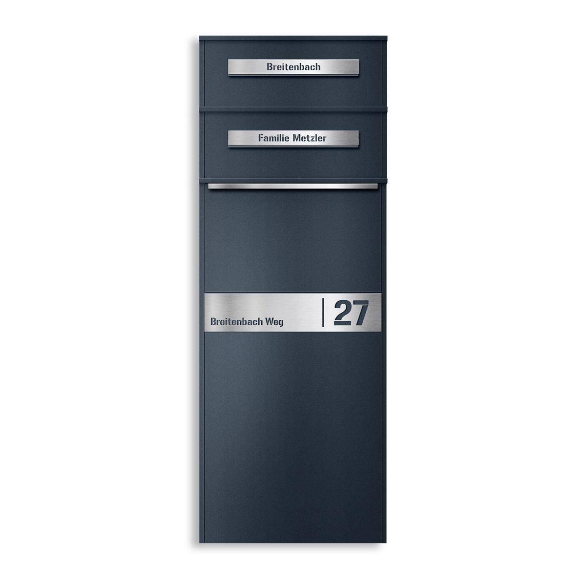 Ihre Adresse und Ihr Name werden präzise aus der Edelstahlplatte ausgeschnitten, und in Kombination mit der anthrazitfarbenen Box entsteht ein stilvoller 3D-Effekt.