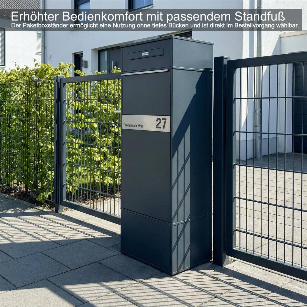 Dank der Pulverbeschichtung in RAL 7016 Anthrazit ist die Paketbox optimal gegen Witterungseinflüsse geschützt und eignet sich ideal für den Außenbereich.