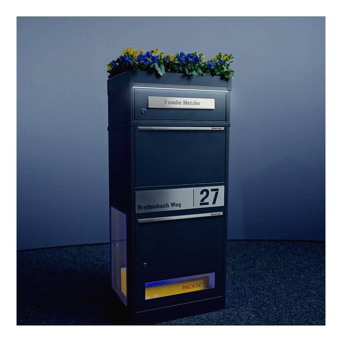 Metzler Briefkasten und Paketbox rostfrei und massiv, Modell Bispo 2 mit Personalisierung