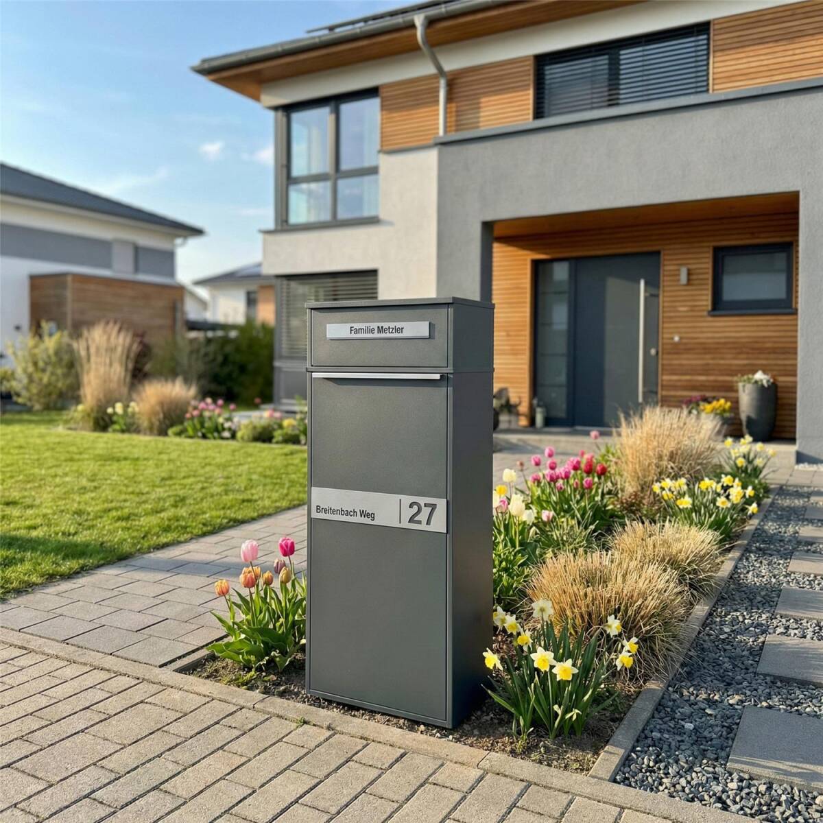 - Individuelle Gravur – Kennzeichnung der Paketbox über zwei gravierte Edelstahlblenden mit Name und Adresse