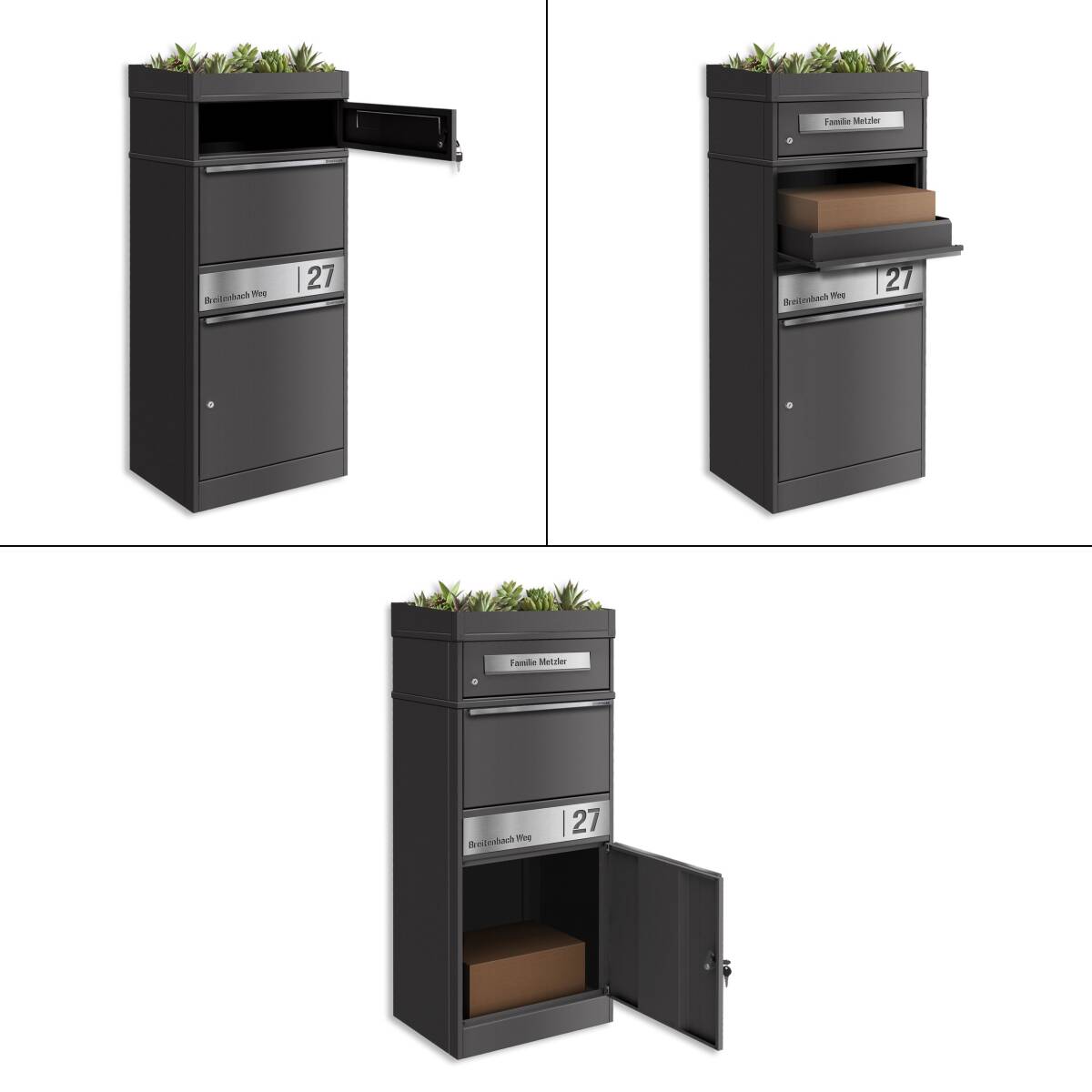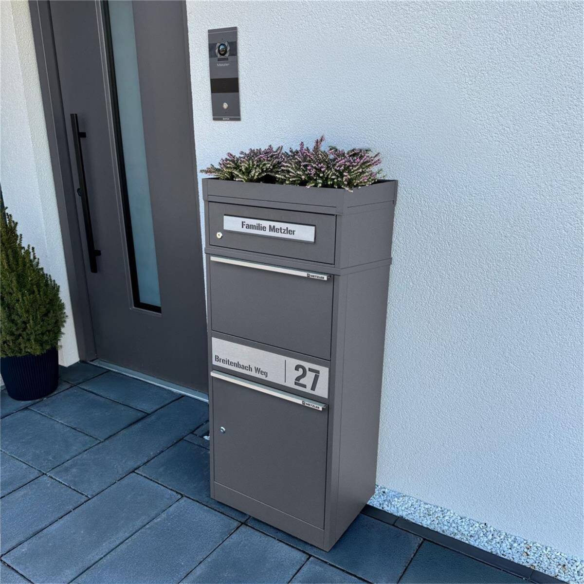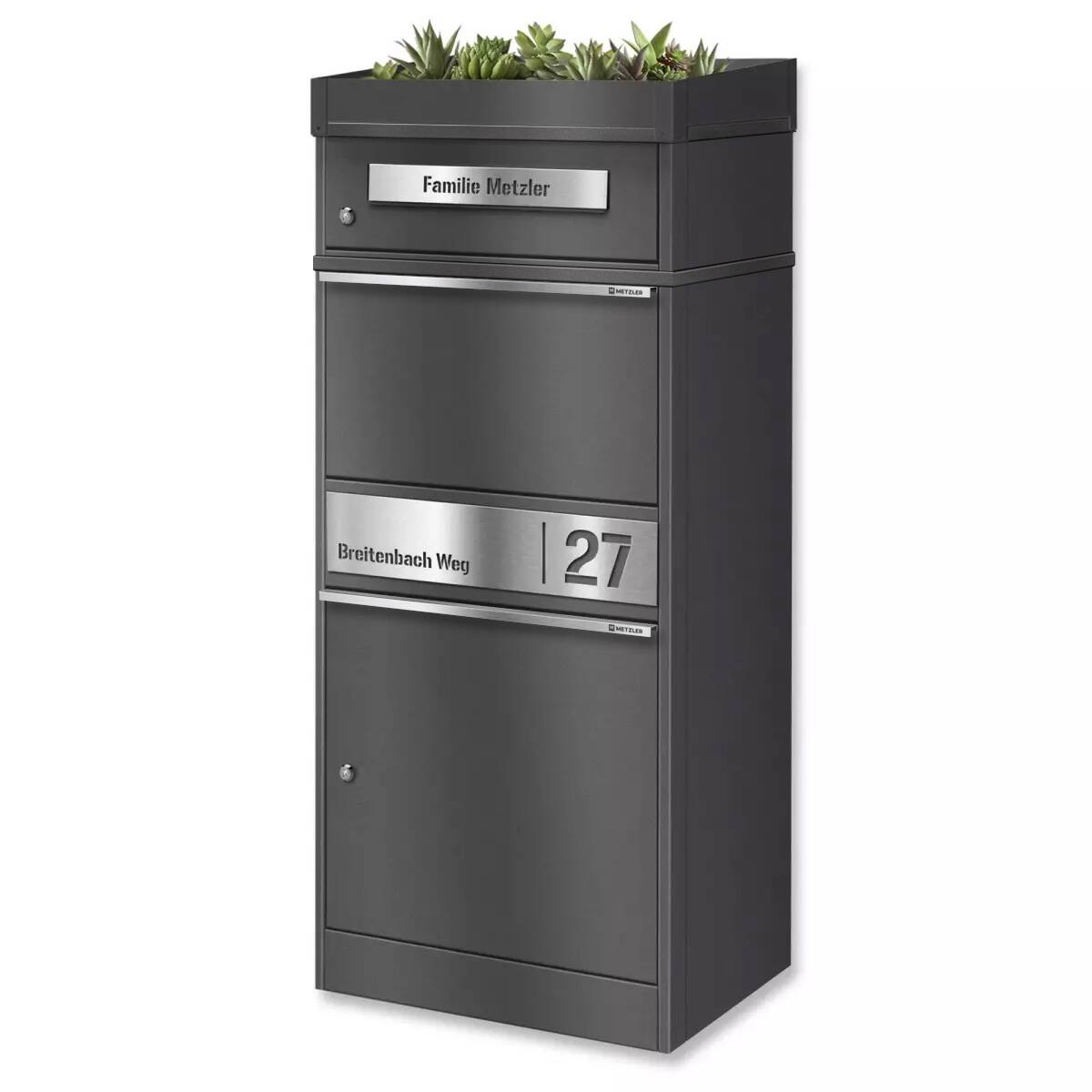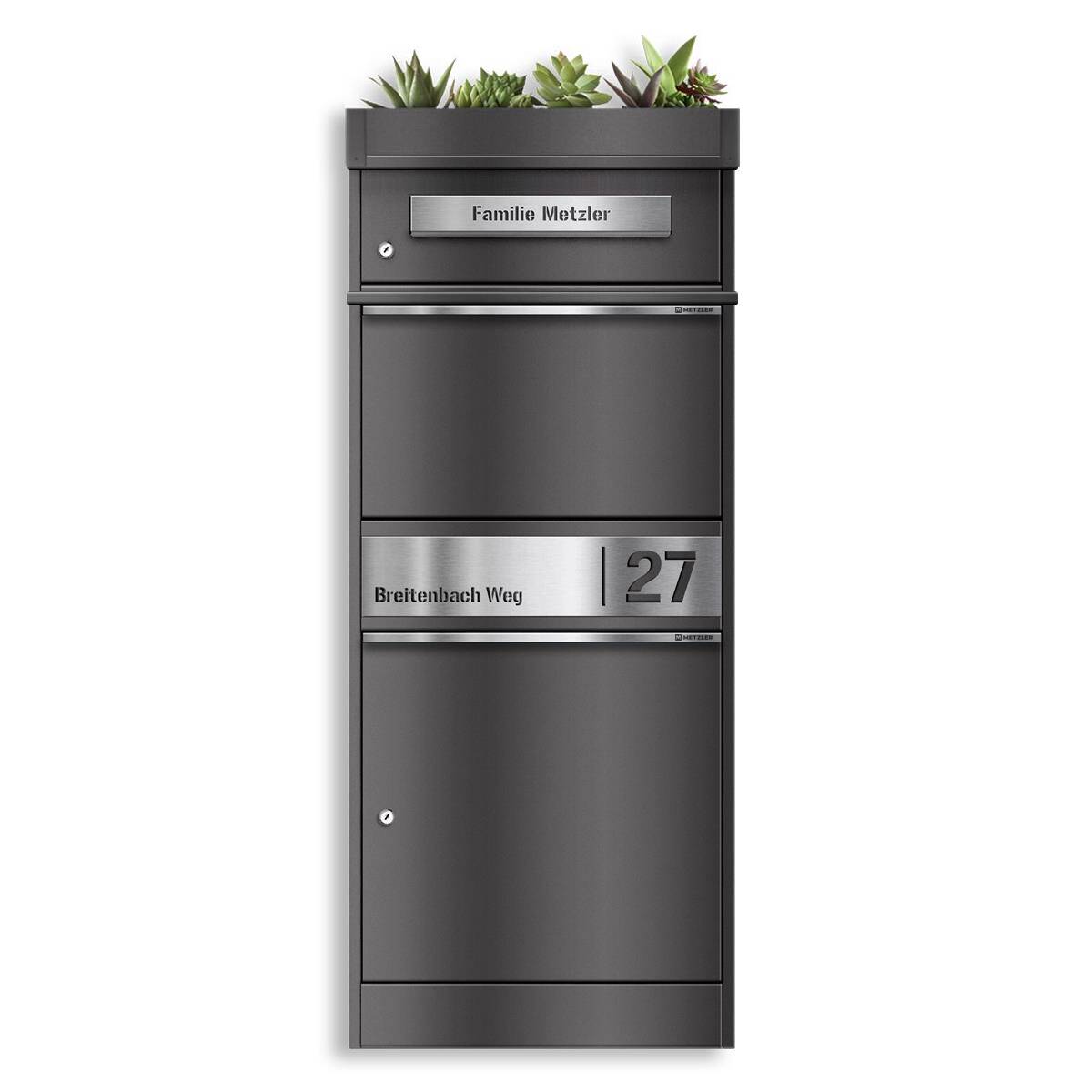 Metzler Paketbox mit Pflanzdach, Eisenglimmer DB 703, rostfrei und massiv, Modell Bispo 2 mit Edelstahl-Namensschild