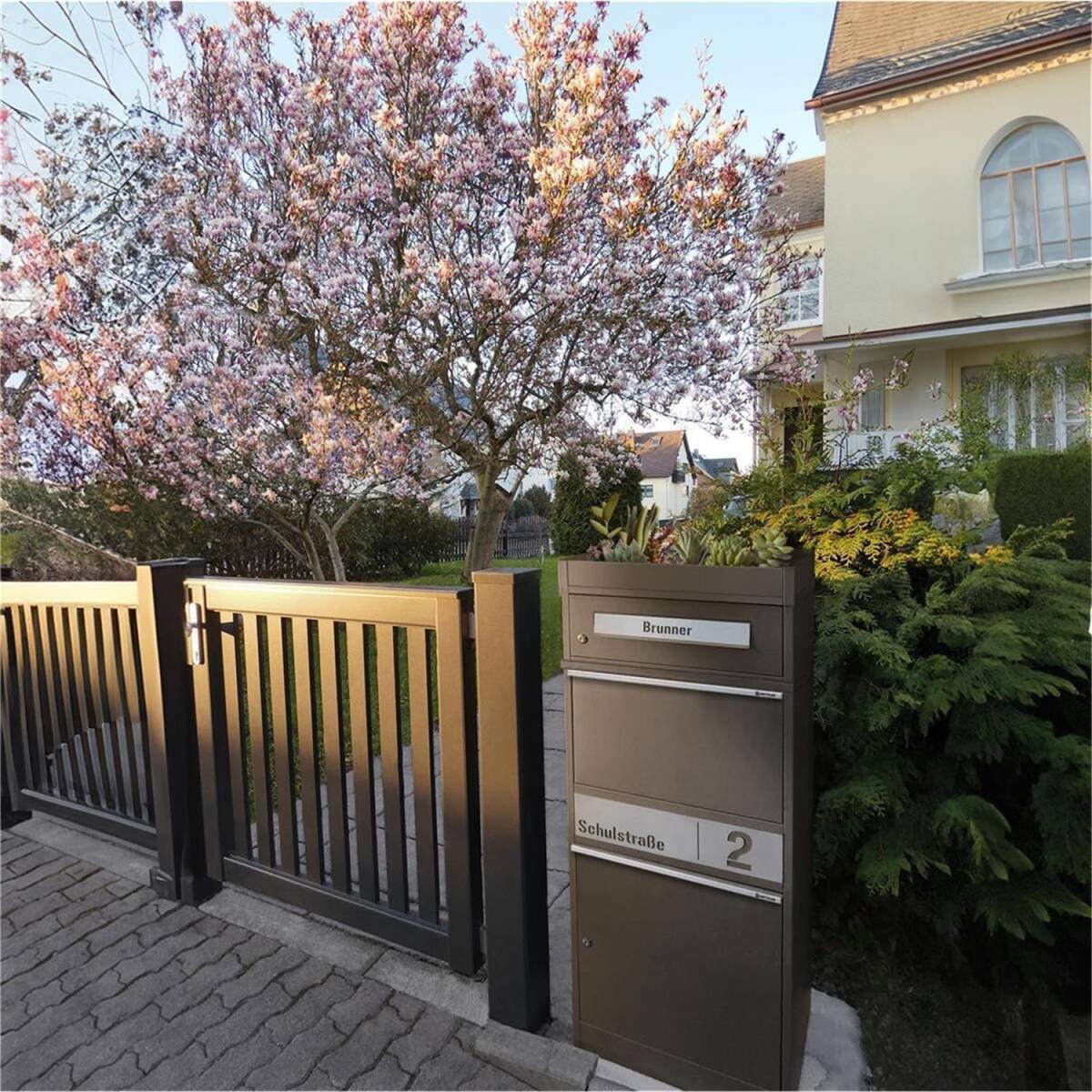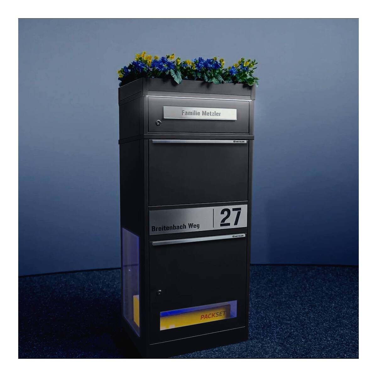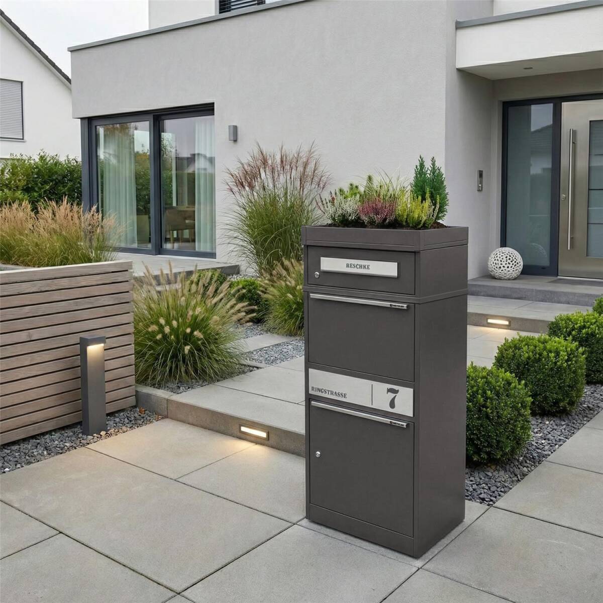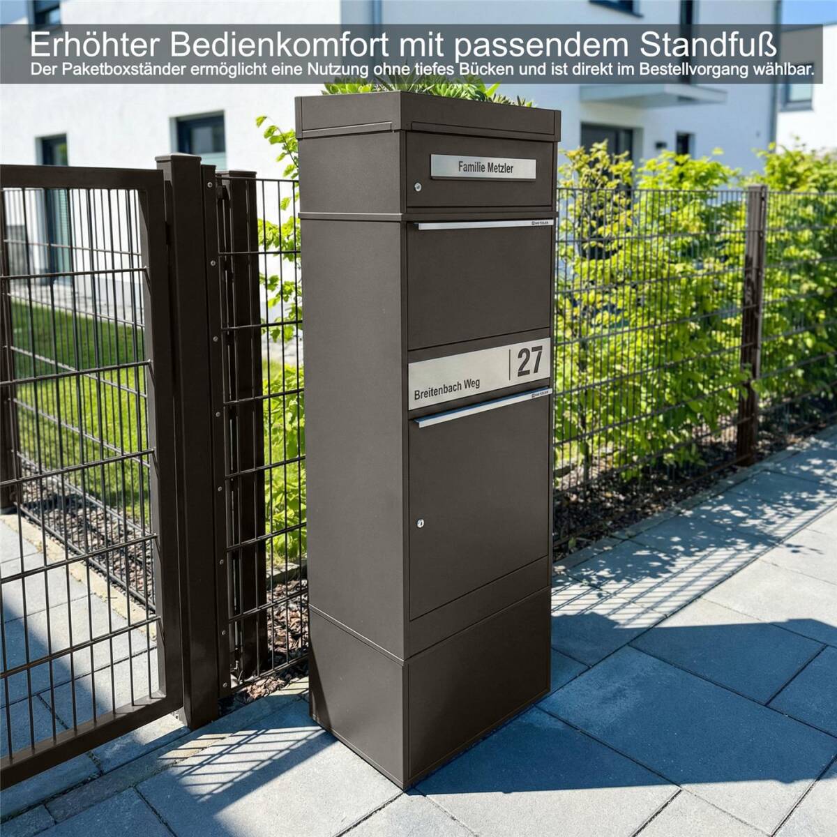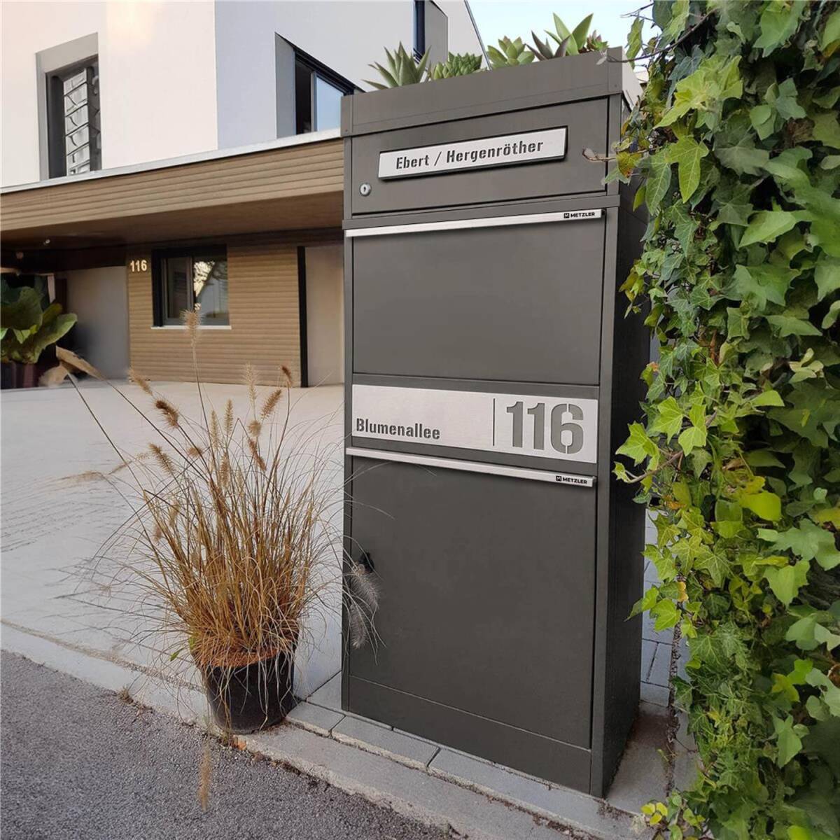 Metzler Paketbox mit Pflanzdach, Eisenglimmer DB 703, rostfrei und massiv, Modell Bispo 2 mit Edelstahl-Namensschild