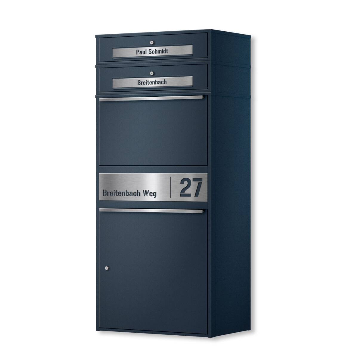 Die Paketbox besteht aus pulverbeschichtetem Stahl und ist besonders stabil sowie wetterfest. Die personalisierbaren Blenden werden aus hochwertigem V2A-Edelstahl gefertigt und grob geschliffen – ideal für den langlebigen Einsatz im Außenbereich.
