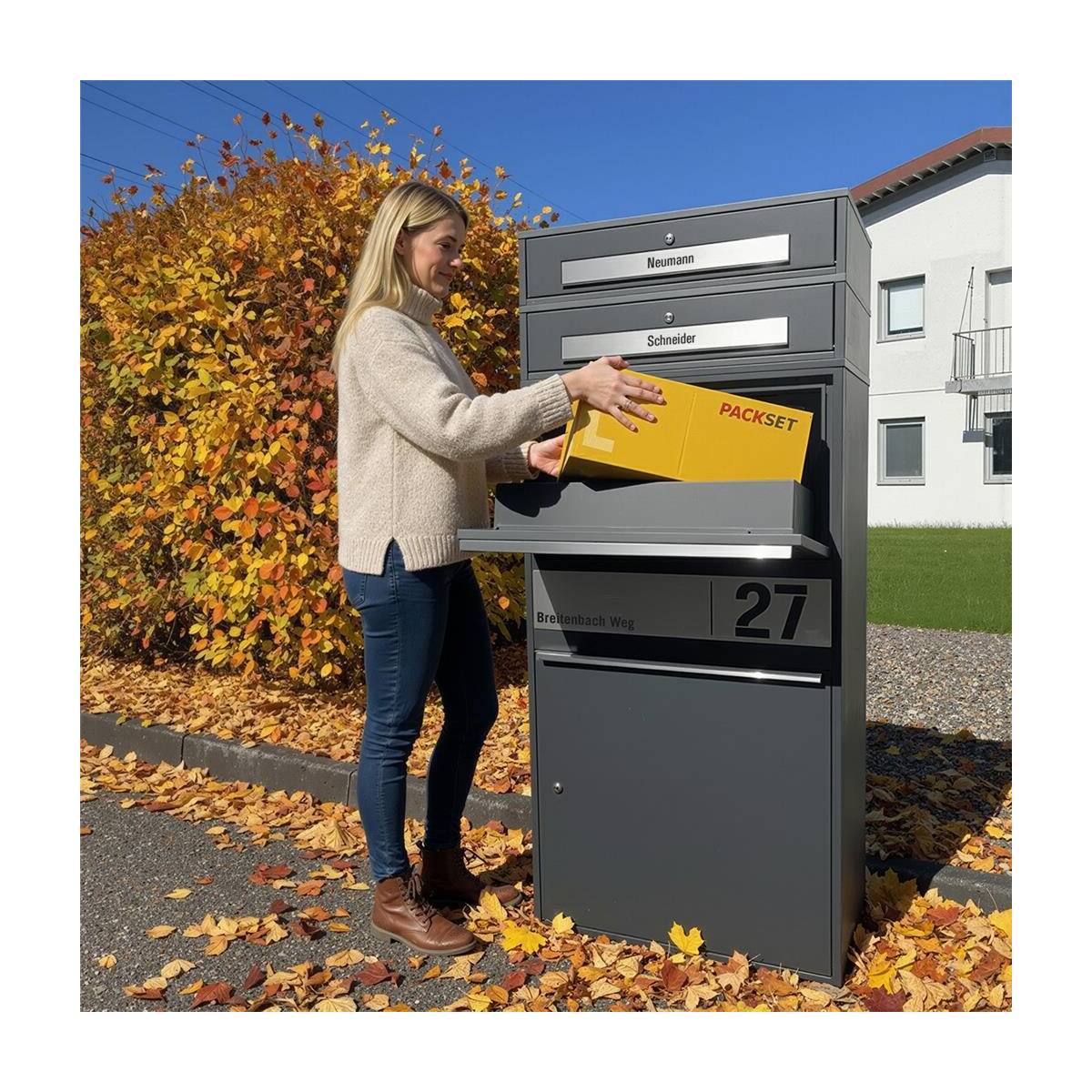 Dank des besonders großen Paketfachs empfangen Sie auch größere Sendungen bis zu 60 x 36 x 22 cm bequem und kontaktlos – rund um die Uhr. Lästige Fahrten zur Packstation oder zum Paketshop gehören damit der Vergangenheit an.