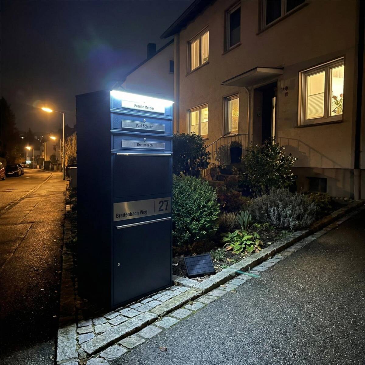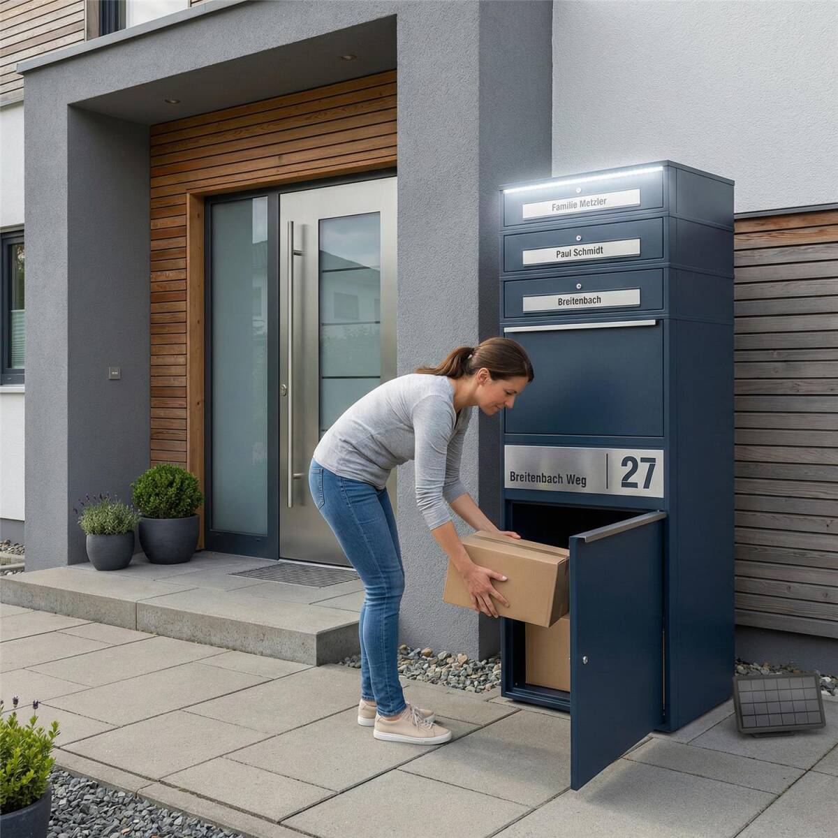 - Solarbetriebene LED-Beleuchtung – Für bessere Sichtbarkeit der Paketbox