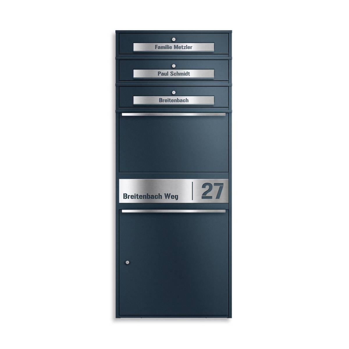 Die Paketbox besteht aus pulverbeschichtetem Stahl und ist besonders stabil sowie wetterfest. Die personalisierbaren Blenden werden aus hochwertigem V2A-Edelstahl gefertigt und grob geschliffen - ideal fĂĽr den langlebigen Einsatz im AuĂźenbereich.
