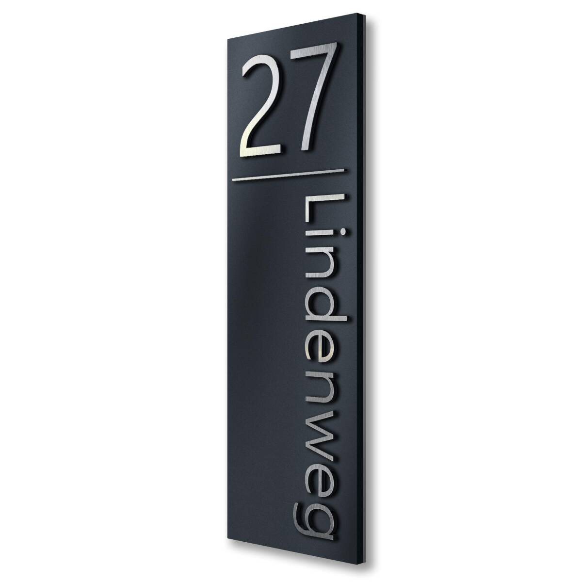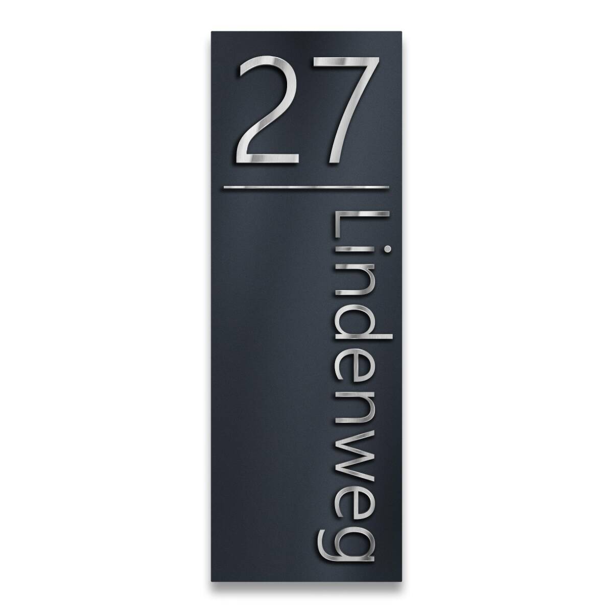 Plaque de numéro de maison dans format vertical avec rue et chiffre en acier inoxydable anthracite