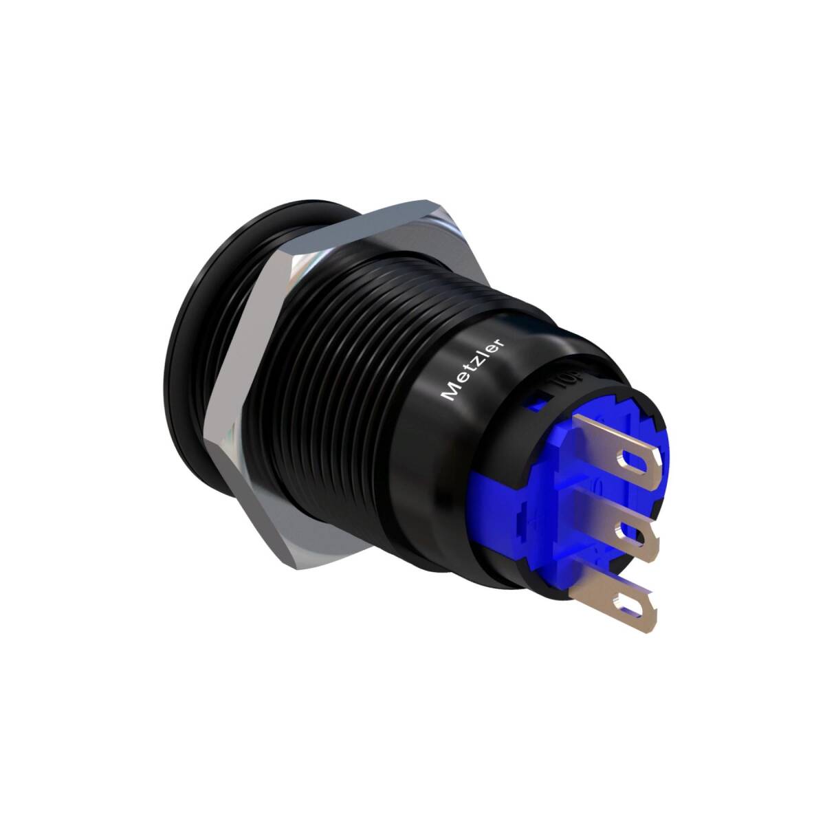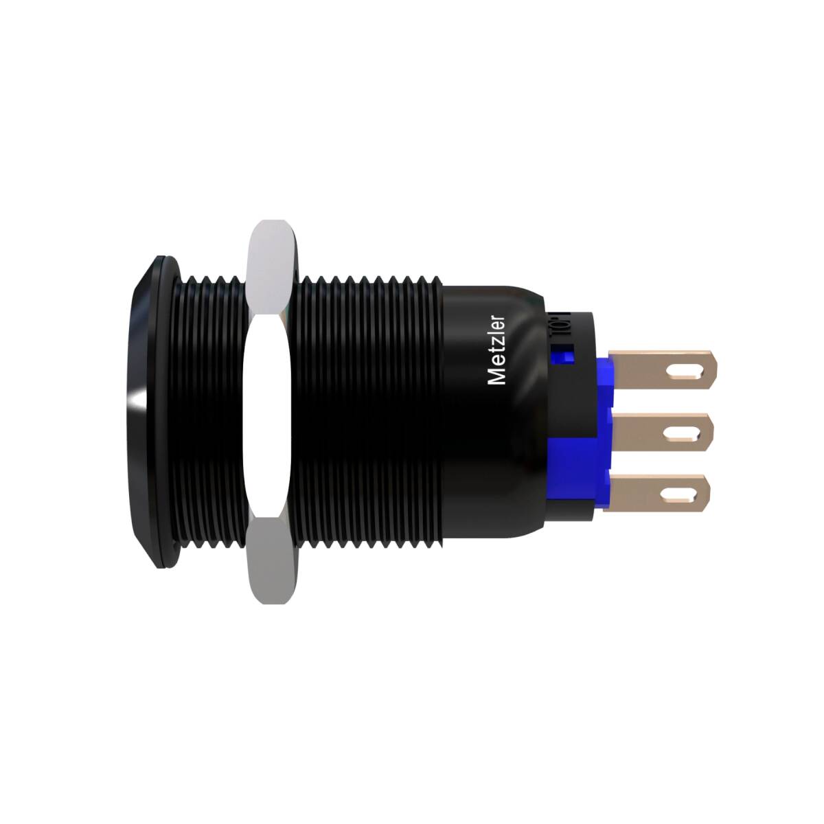 Contenuto della confezione: 1× Metzler - Pulsante 19mm - IP67 IK10 - Alluminio - Piatto - Connessione a saldare, 1× Dado esagonale, 1× O-Ring, Capicorda piatti