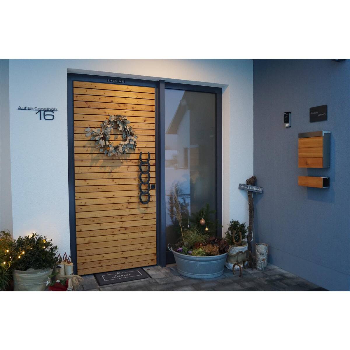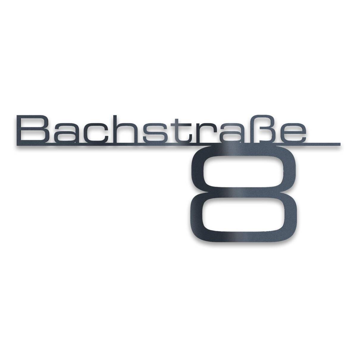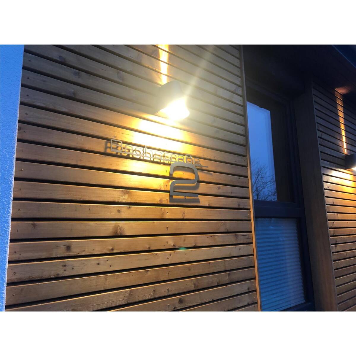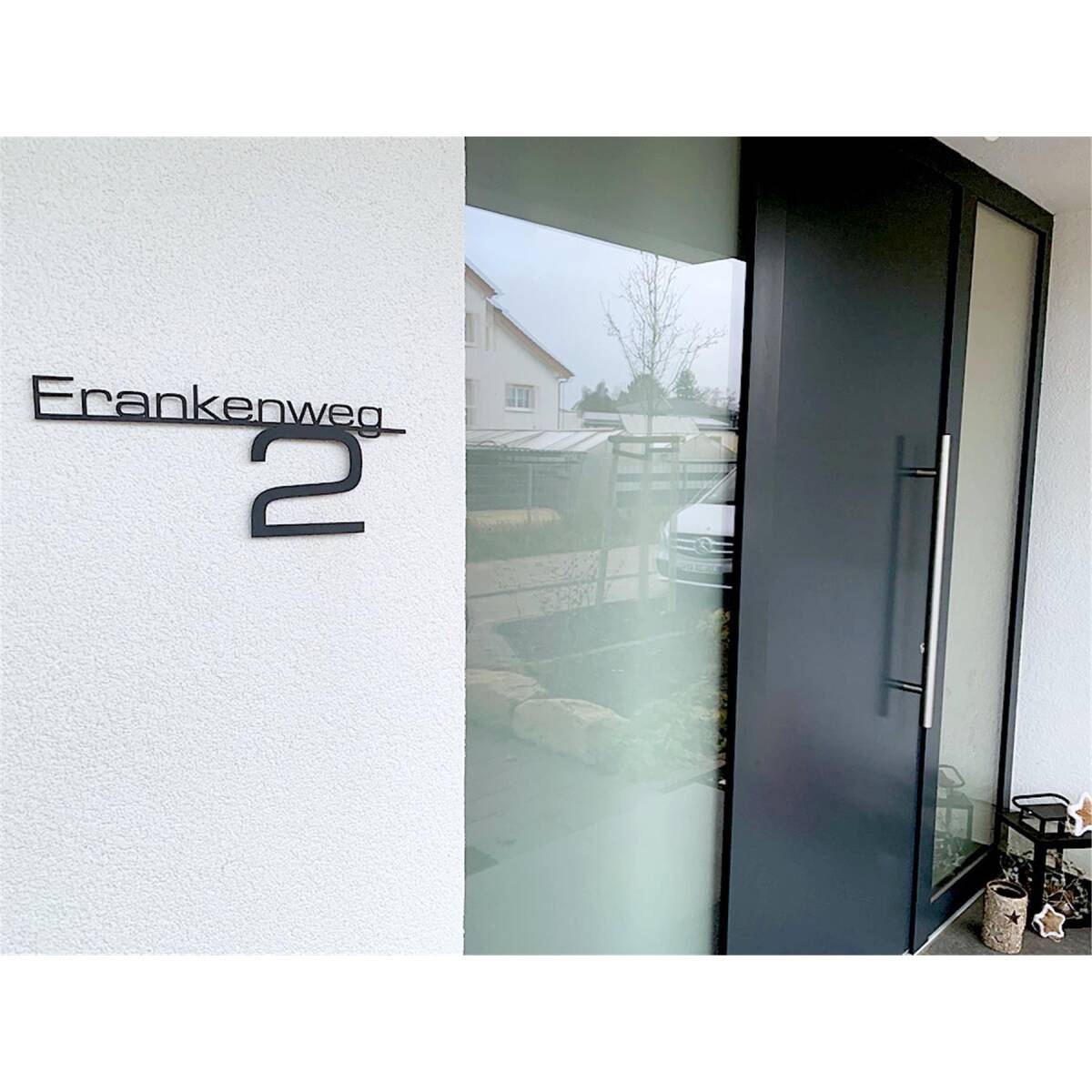 Grazie ai perni a saldare sul retro, la scritta può essere montata facilmente sulla parete di casa, in modo che il fissaggio sia completamente invisibile e la scritta fluttui davanti alla facciata. Le singole lettere del nome della via e del numero civico sono collegate dal listello decorativo (altezza 5 mm).