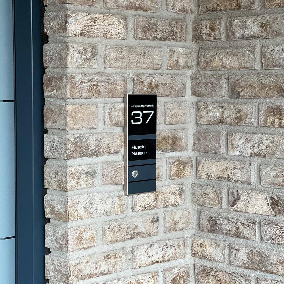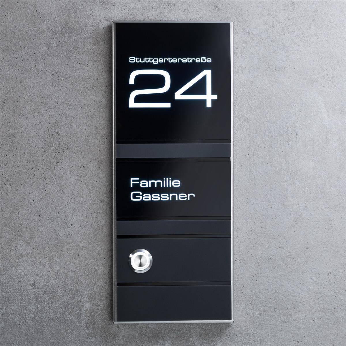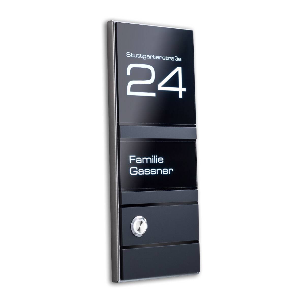 Pour personnaliser la plaque sonnette, le verre acrylique est inscrit de votre rue, numéro de maison et nom, par laser à haute précision. Vous avez le choix parmi plusieurs polices de caractères et 6 orientations.