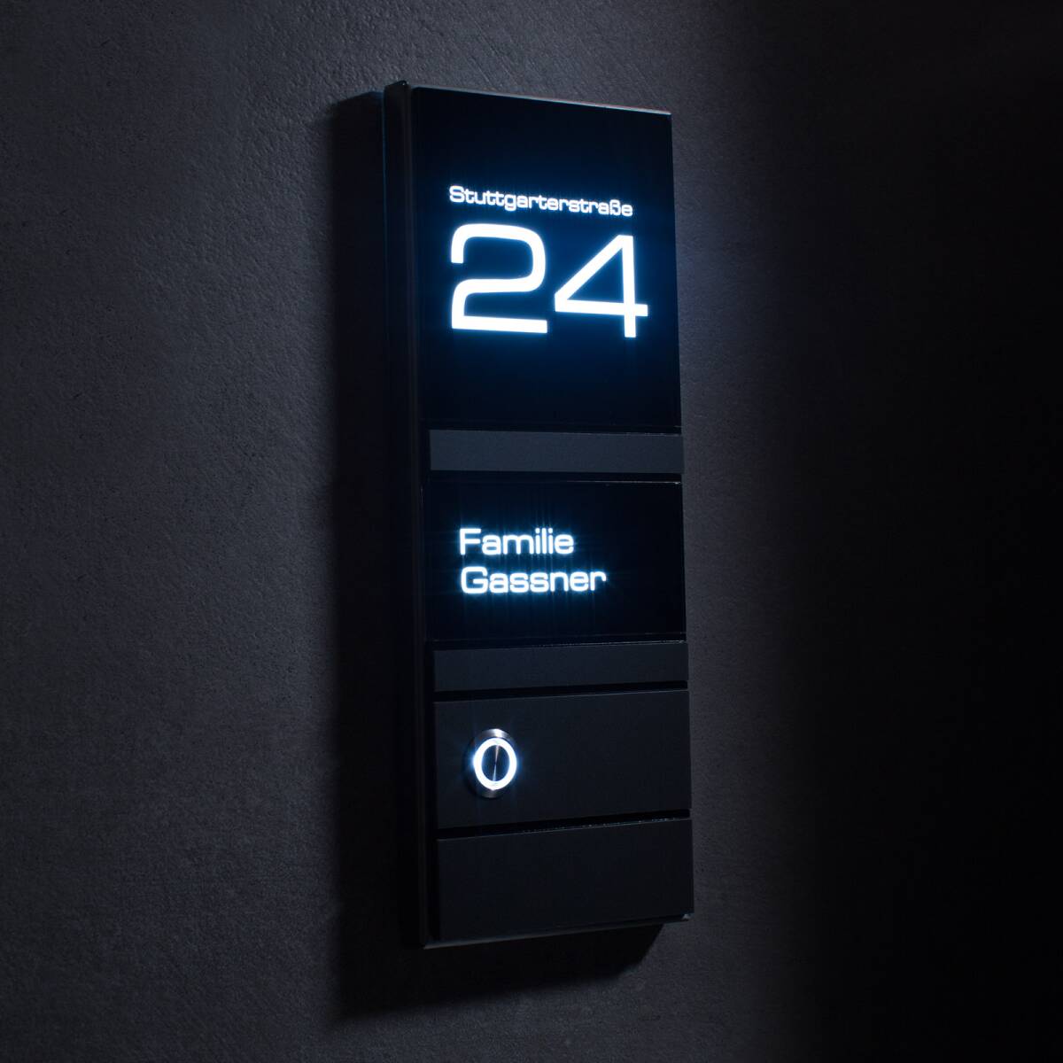 La gravure est soulignée par l’illumination LED intégrée, disponible dans les couleurs blanc, bleu, vert ou jaune. L’illumination est surtout pratique dans la nuit, permettant aux visiteurs ou à votre facteur d’identifier votre sonnette sans problèmes.