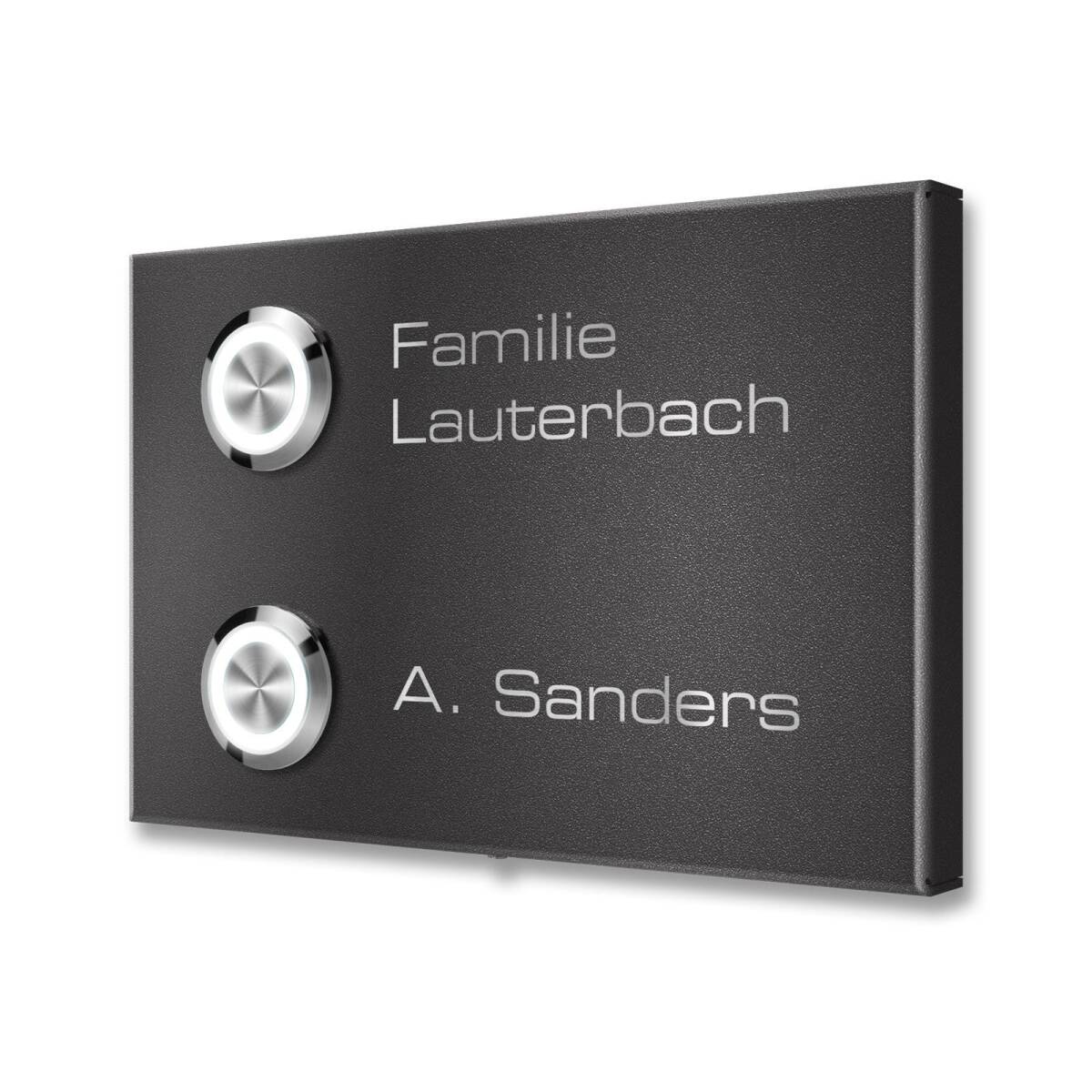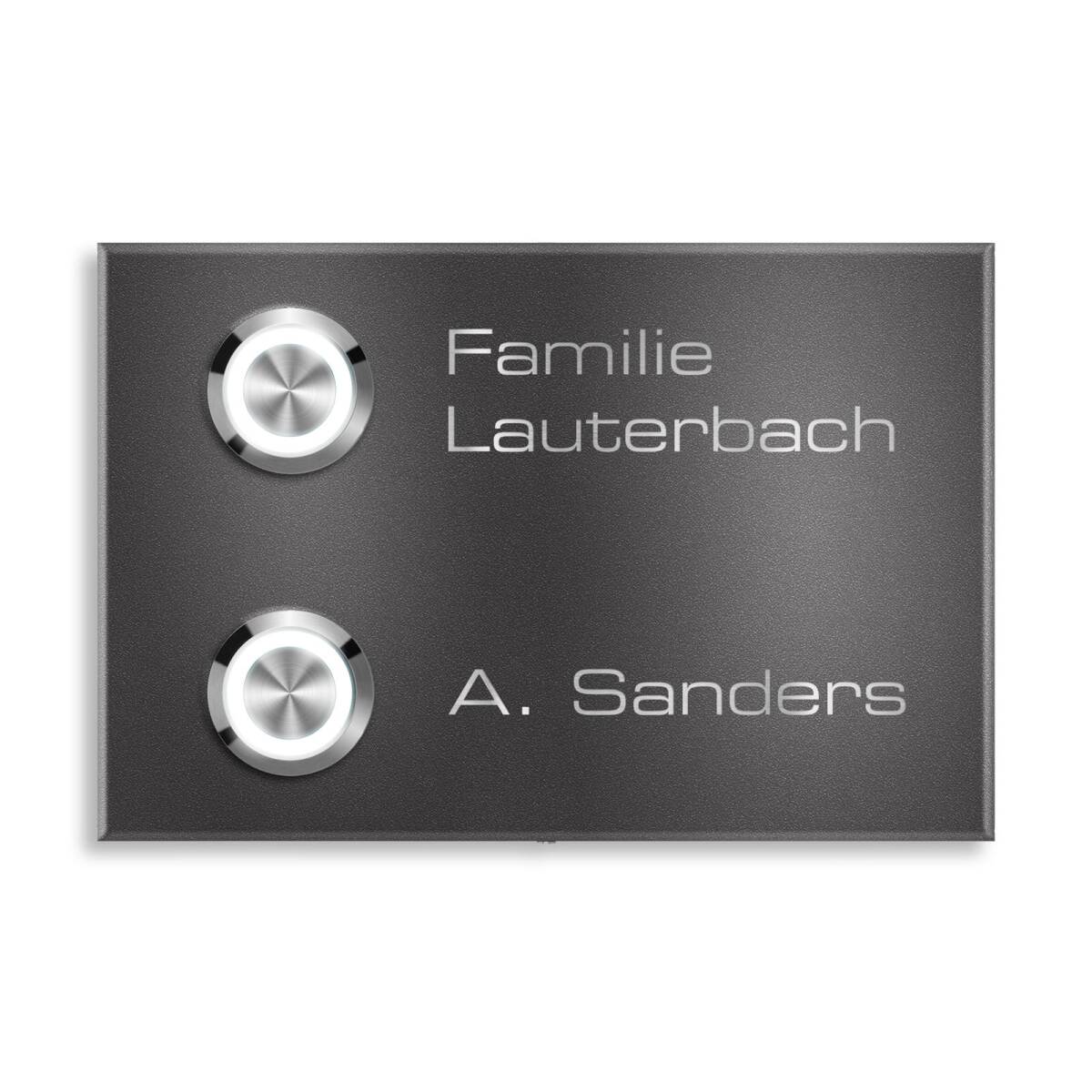 La sonnette pour immeubles collectifs avec deux parties convainc dans plusieurs égards : la gravure laser personnalisée sur la sonnette brille avec sa clarté et sa bonne lisibilité. Pour la gravure optionnelle, nous vous offrons le choix entre 20 polices de caractères.
