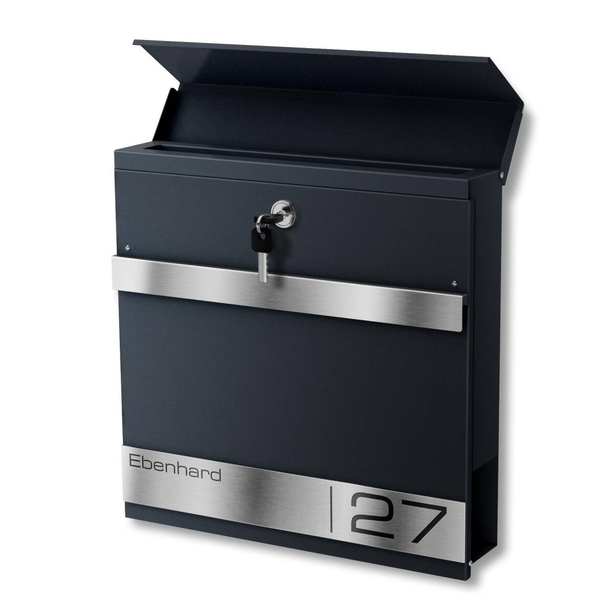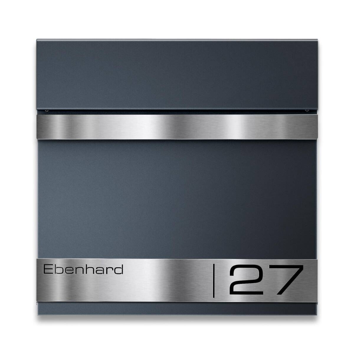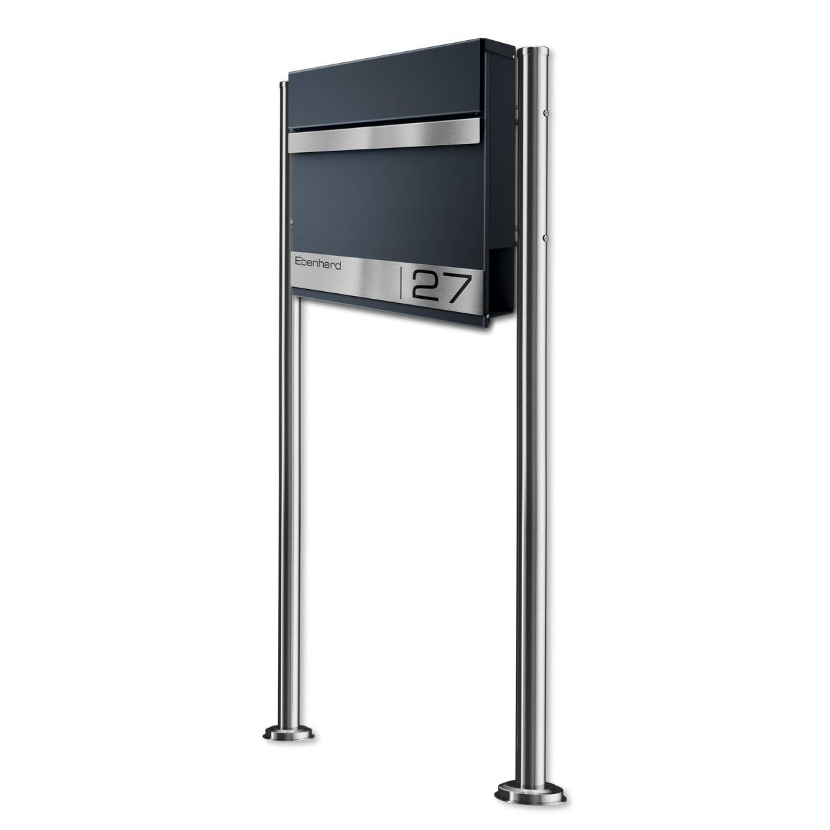 Der Standbriefkasten wurde aus hochwertigem, massivem Stahl hergestellt. Um den Briefkasten noch witterungsbeständiger zu gestalten, wird der Stahl nach der Bearbeitung aufwendig in Anthrazitgrau RAL7016, Feinstruktur matt, pulverbeschichtet. So können dem Briefkasten weder Wind noch Wetter etwas anhaben. Als besonderes Highlight erhält der Briefkasten eine erhabene Gravurleiste aus rostfreiem V2A Edelstahl, die Sie mit Ihrem Familiennamen und Ihrer Hausnummer lasergravieren lassen können. Hierfür können Sie aus zahlreichen modernen Schriftarten wählen und so Ihrem Briefkasten einen individuellen Touch verleihen.