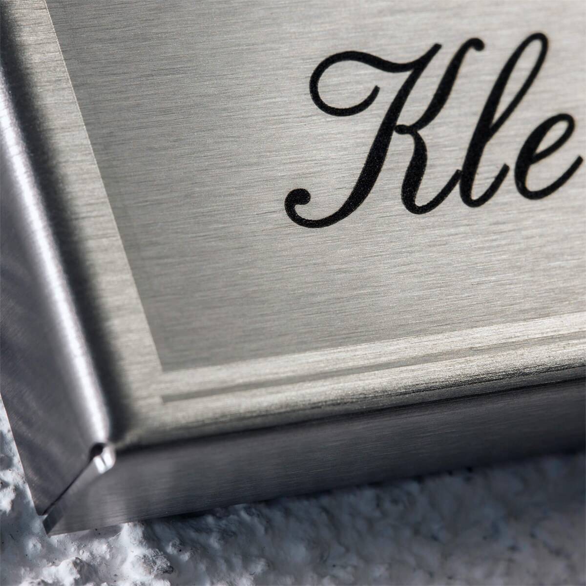 Die optionale Lasergravur auf der Klingel besticht durch Klarheit und gute Lesbarkeit. Für die individuelle Gravur stehen Ihnen 20 ausgesuchte Schriften sowie 3 unterschiedliche Ausrichtungen zur Verfügung.