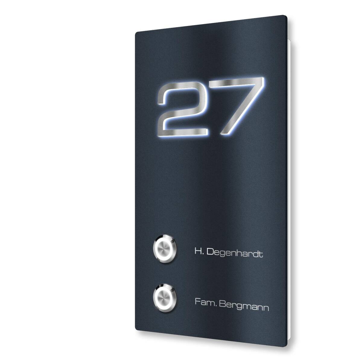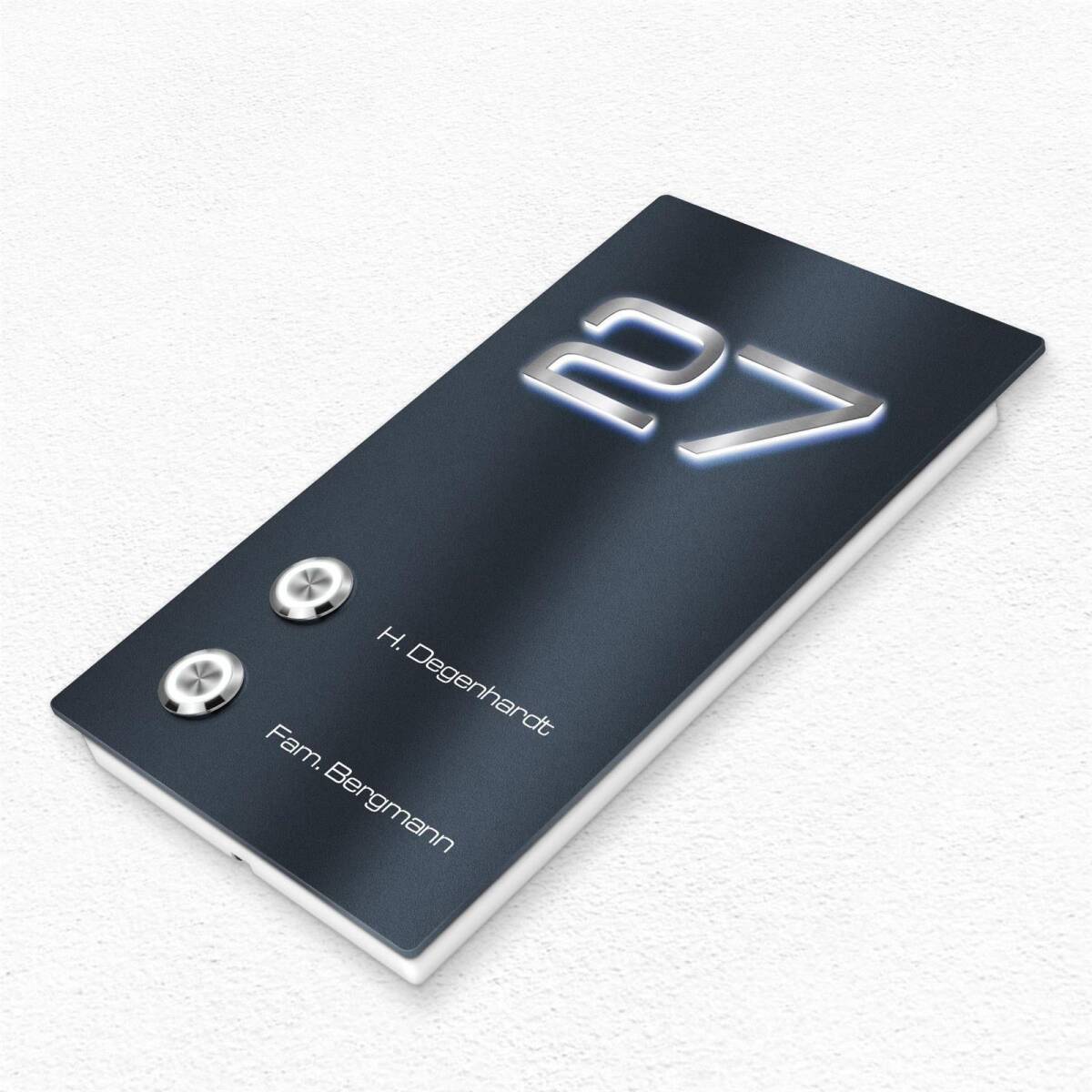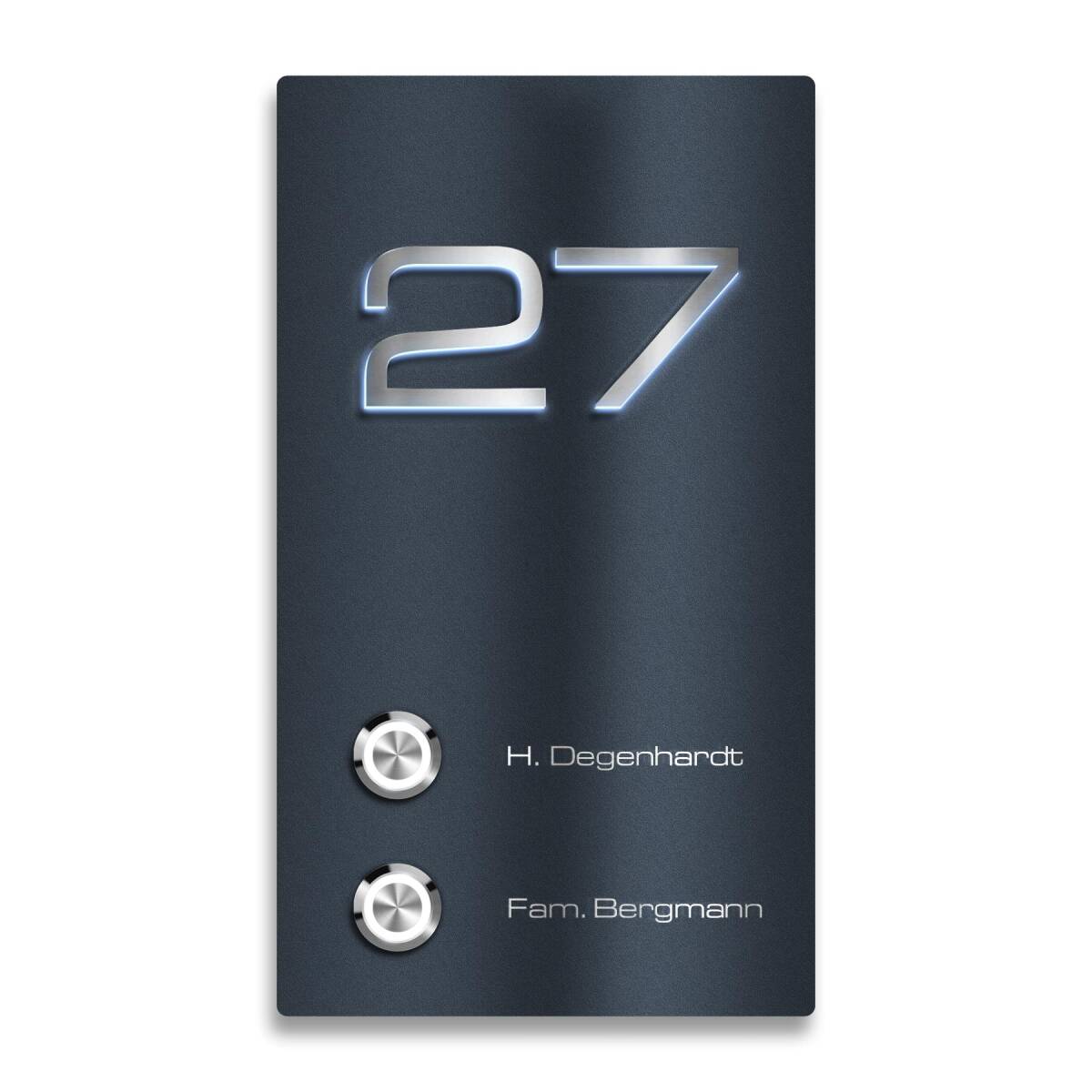 Mehrere Highlights machen diese Türklingel zu etwas ganz Besonderem. Die individuelle Lasergravur auf der Klingel besticht durch Klarheit und gute Lesbarkeit. Durch die hochpräzise gefrästen, erhabenen 3D-Profilbuchstaben erhält das Schild sein einzigartiges Aussehen. Besonders die integrierte Beleuchtung punktet auf ganzer Linie, denn dadurch ist das Klingelschild selbst im Dunkeln gut zu erkennen und Ihre Hausnummer problemlos lesbar.
