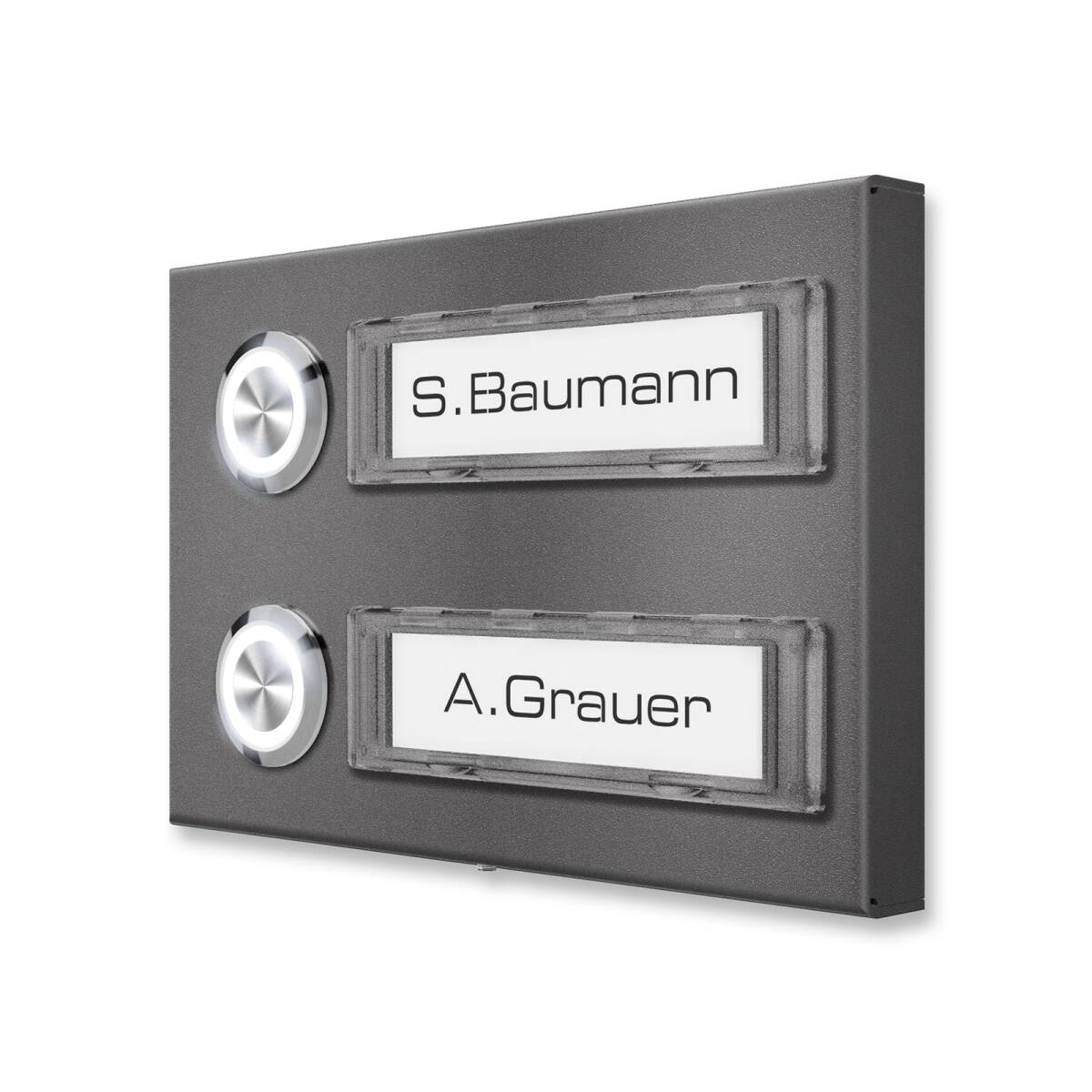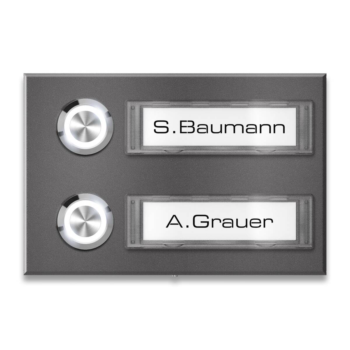 Durch die ansprechenden Namensschilder und die Drucktaster wird die massive, 11 mm starke Klingel zum Blickfang in Ihrem Eingangsbereich. Besonders praktisch bei den Klingelschildern: sie sind jederzeit austauschbar. Bei Mieterwechsel oder Namensänderung muss lediglich das Papier des Namensschilds getauscht werden, was durch das praktische Klick-System im Handumdrehen erledigt ist. Hierfür können Sie ganz einfach unsere interaktive Druckvorlage als ausfüllbares PDF nutzen. Zudem können Sie das Schild optional mit LED-Beleuchtung bestellen.