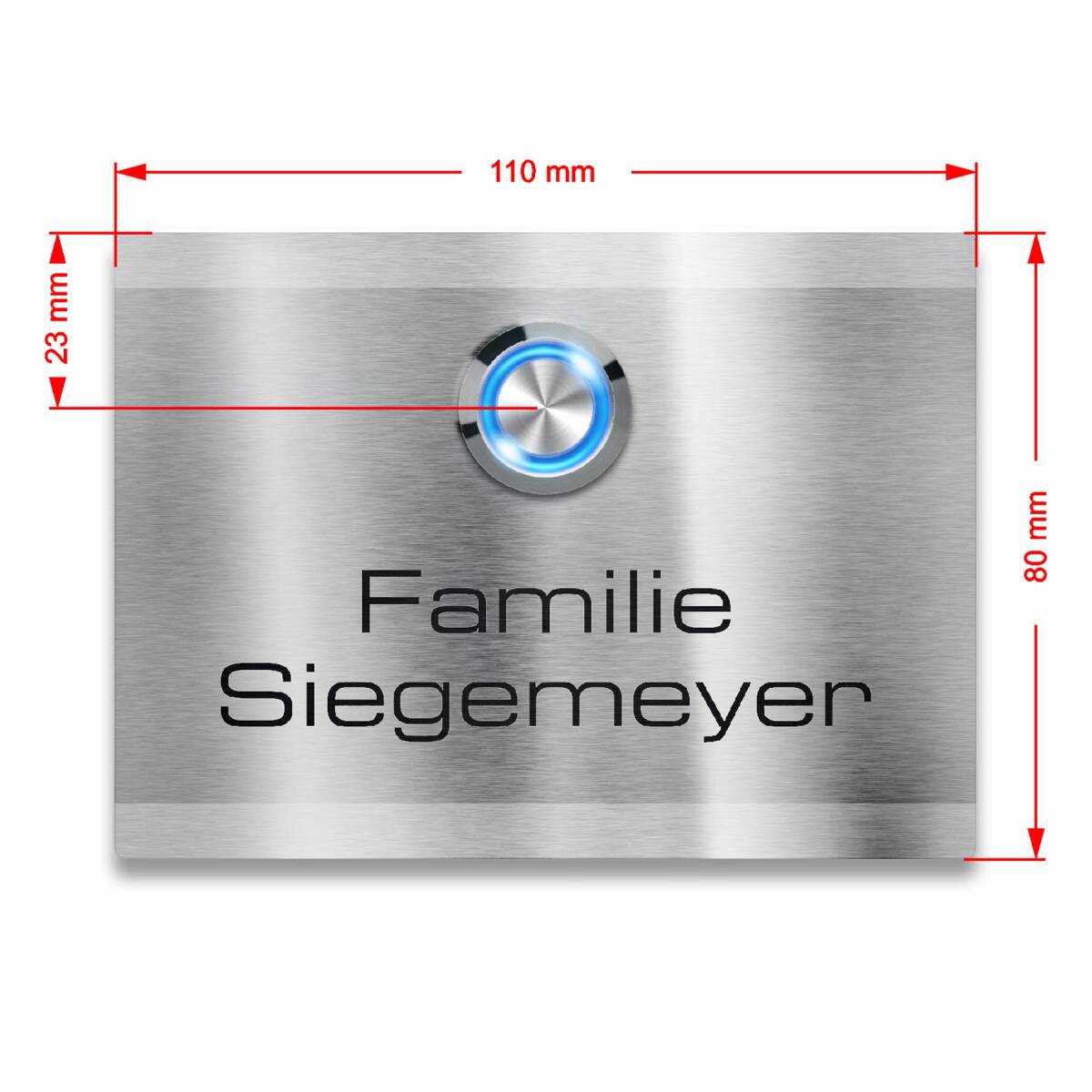 Das klassische Klingelschild – Made in Germany – vereint zeitloses Design mit Eleganz. Die rechteckige Form passt zu nahezu jedem Hauseingang. Durch das aufgebrachte Hologramm am oberen und unteren Rand entsteht eine Türklingel in atemberaubender Optik. Durch die Verwendung einer massiven, 3 mm starken, grob geschliffenen Edelstahlplatte fühlt sich die Türklingel wertig und schwer an. Da der Edelstahl nichtrostend ist, sieht Ihre Klingel auch nach Jahren noch aus wie am ersten Tag. Die Lasergravur des eigenen Namens auf der Klingel besticht durch Ihre Klarheit und gute Ablesbarkeit. Für die Gravur stehen Ihnen 20 ausgesuchte Schriften sowie 5 unterschiedliche Ausrichtungen zur Verfügung. Durch den eingebauten Edelstahl Drucktaster mit LED sehen Ihre Gäste den Klingelknopf bereits von weitem. Für die Ringbeleuchtung des großen Klingeltasters stehen Ihnen unterschiedliche Farben zur Verfügung. Den Klingeltaster können Sie an die in Ihrem Haus bestehenden Klingeldrähte anschließen. Für die Montage der Türklingel bieten wir zwei unterschiedliche Optionen. Befestigung per Schraube und Dübel oder Silikonkleber.