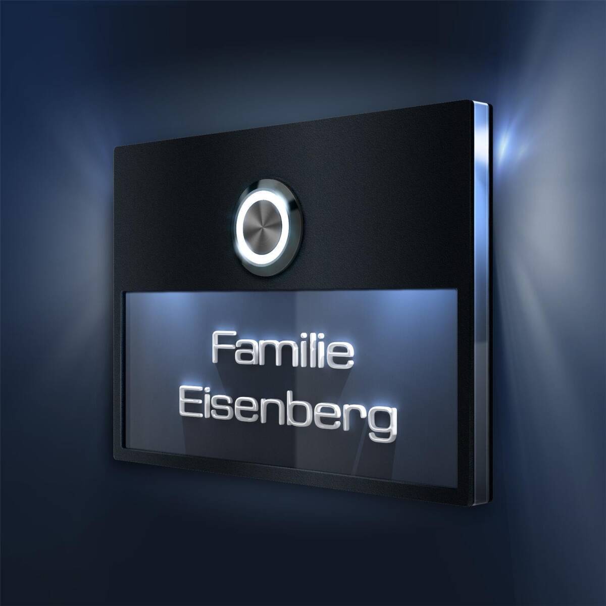 Besonders die integrierte Beleuchtung punktet auf ganzer Linie, denn dadurch ist das Klingelschild selbst im Dunkeln gut zu erkennen und Ihr Name problemlos lesbar. Die Kombination aus Beleuchtung und Tiefengravur sorgt für einen Schattenwurf, welcher den 3D-Effekt deutlich verstärkt.