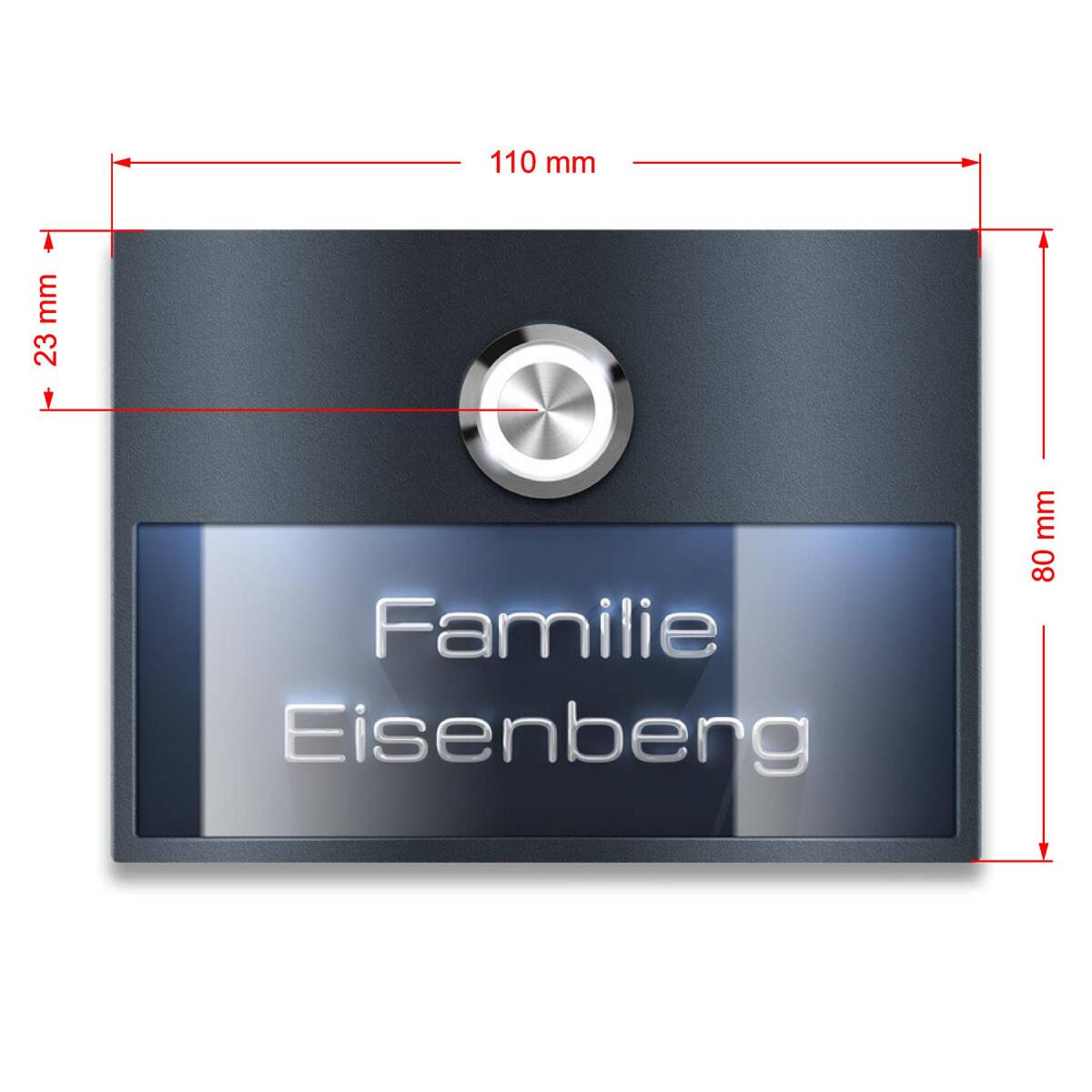 Der eingebaute Klingeltaster ist ebenso pflegeleicht und witterungsbeständig wie das Klingelschild, denn er ist aus Edelstahl und wasserdicht nach IP67. Für die optionale Ringbeleuchtung des Drucktasters stehen Ihnen unterschiedliche Farben (Weiß, Blau, Rot, Grün, Gelb oder ohne LED) zur Verfügung. Den Klingeltaster können Sie ganz einfach an die in Ihrem Haus bestehenden Klingeldrähte anschließen.