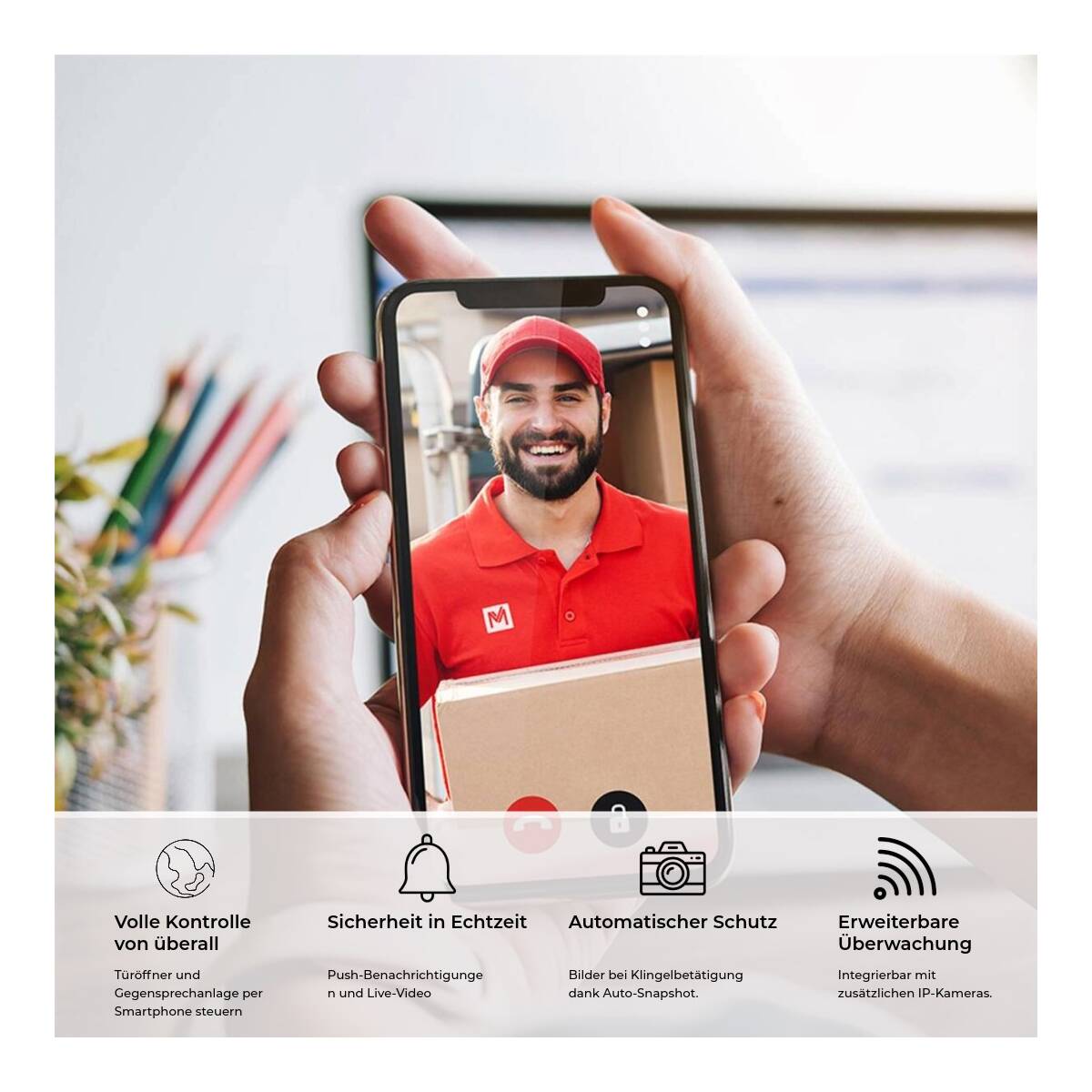 Quando siete fuori casa, potete beneficiare del controllo del VDM10 tramite l'App gratuita per smartphone (compatibile con Android e iOS). Potete usare il vostro smartphone come citofono e, grazie alla notifica in tempo reale, aprire la porta di casa o il garage.