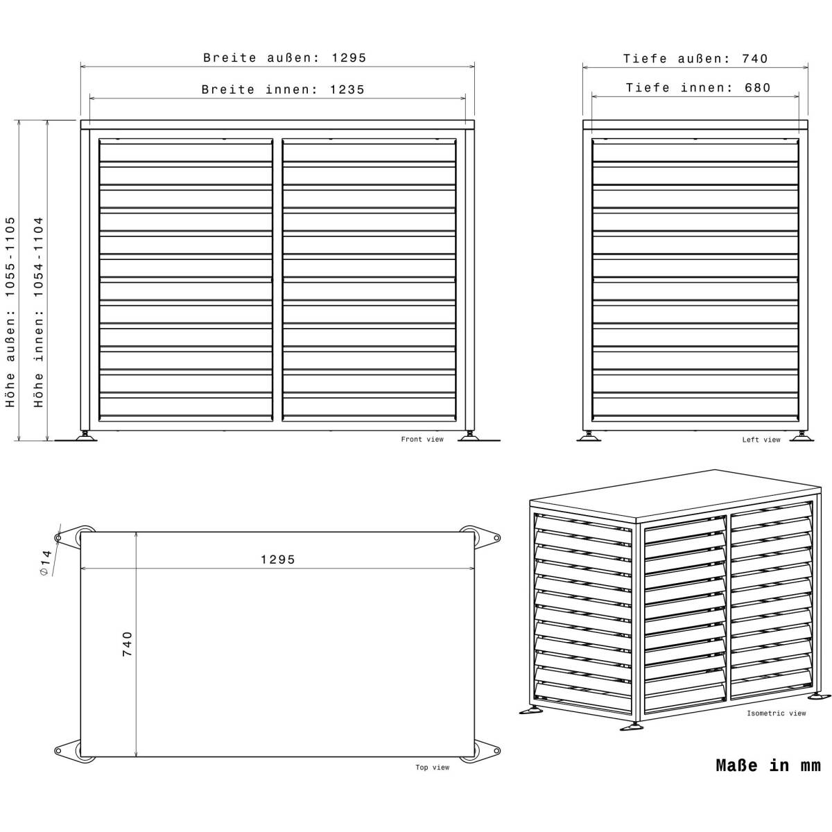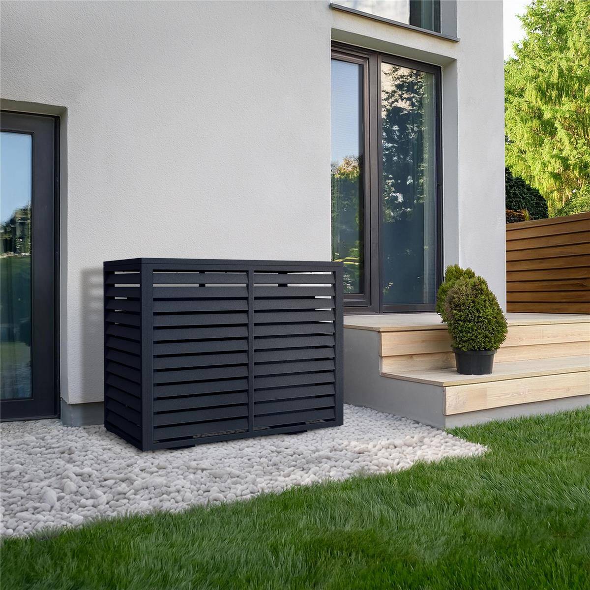Die Wärmepumpenabdeckung ist für Wärmepumpen mit maximalen Abmessungen von 113,5 x 100,4 x 58 cm (BxHxT) ausgelegt, um eine optimale Luftzirkulation zu gewährleisten.