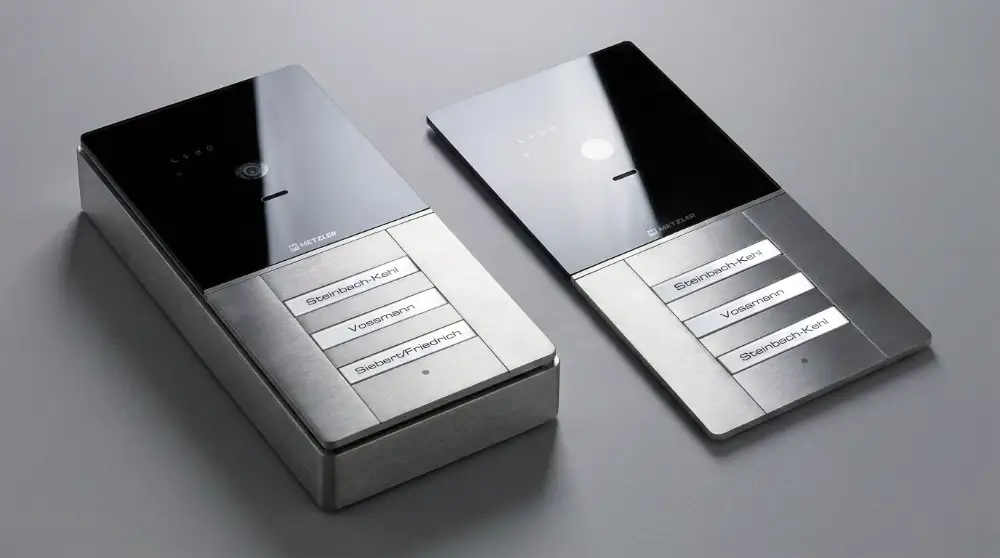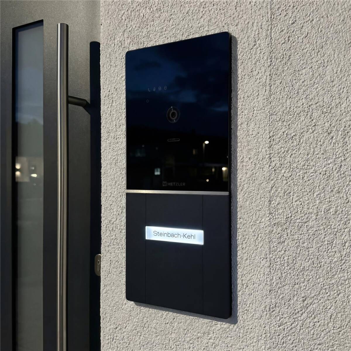 Flache Kameralinse hinter getöntem Glas für ein ruhiges, zeitloses Erscheinungsbild. Beleuchtete und austauschbare Namensschilder gewährleisten gute Lesbarkeit und eine flexible Anpassung bei Namensänderungen.