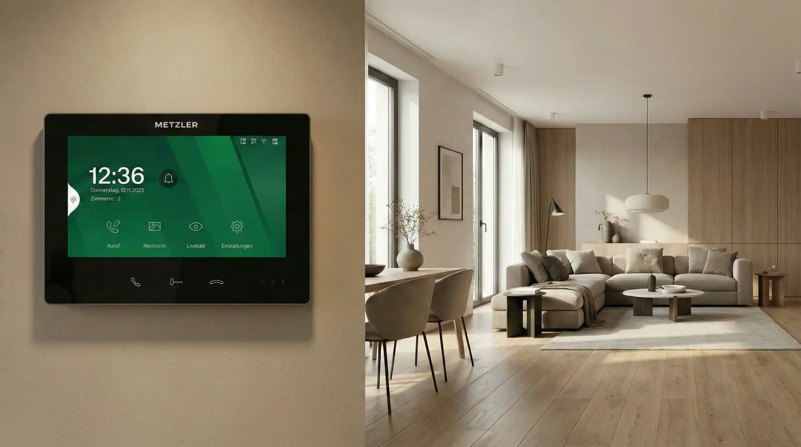 Die 7-Zoll-Innenstation dient als zentrale Bedieneinheit für Livebild, Gegensprechen und Türöffnung und ist im Bestellvorgang in Weiß oder Schwarz erhältlich. Ergänzend ermöglicht eine kostenlose Smartphone-App den mobilen Zugriff auf Funktionen wie Livebild und Gesprächsannahme.