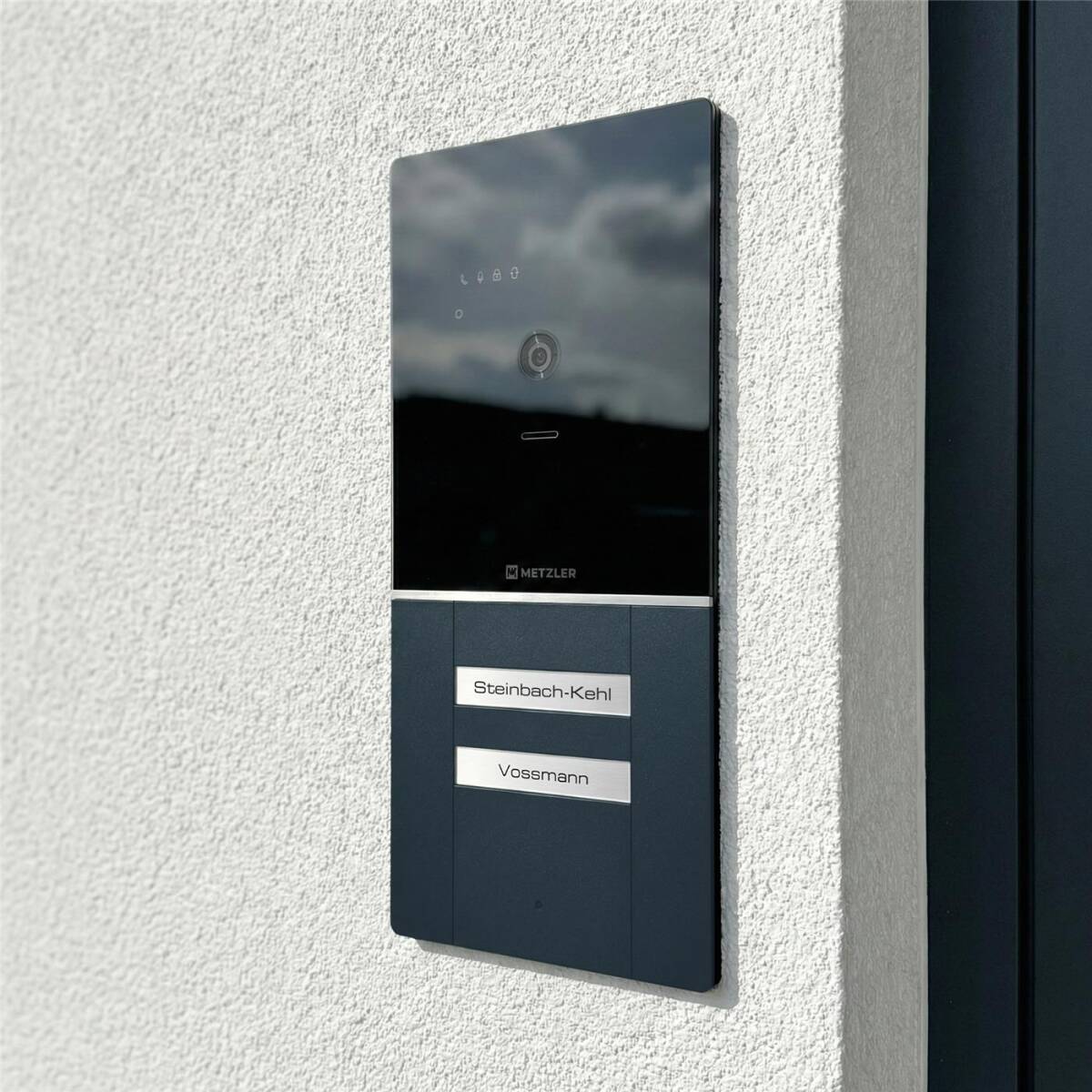 Flache Kameralinse hinter getöntem Glas für ein ruhiges, zeitloses Erscheinungsbild. Beleuchtete und austauschbare Namensschilder gewährleisten gute Lesbarkeit und eine flexible Anpassung bei Namensänderungen.
