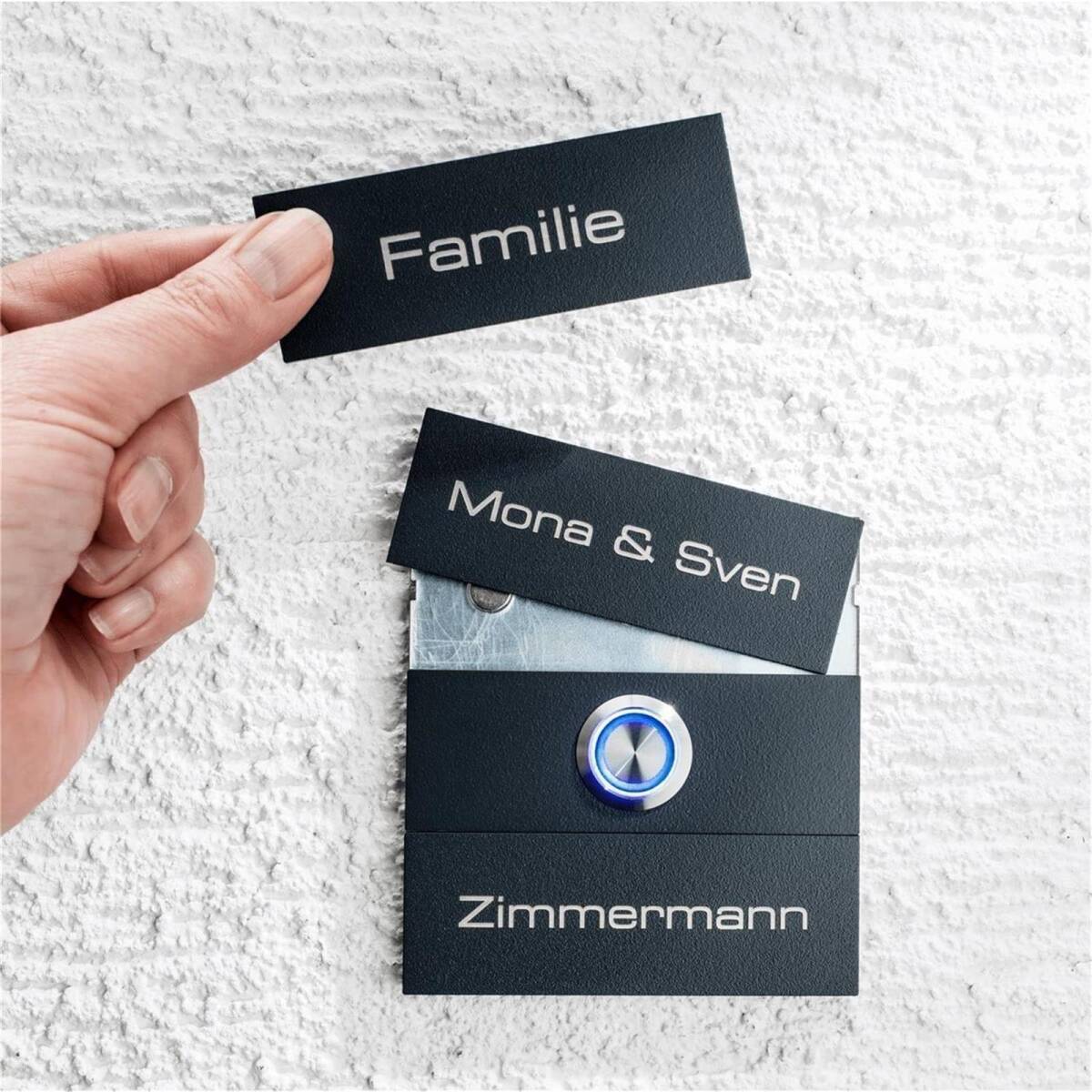 Sollte sich der Name auf dem bestehenden Namensschild durch Umzug, Heirat o.ä. geändert haben, erhalten Sie hier passend zu Türklingeln der Magneto-Serie ein austauschbares Namensschild.
