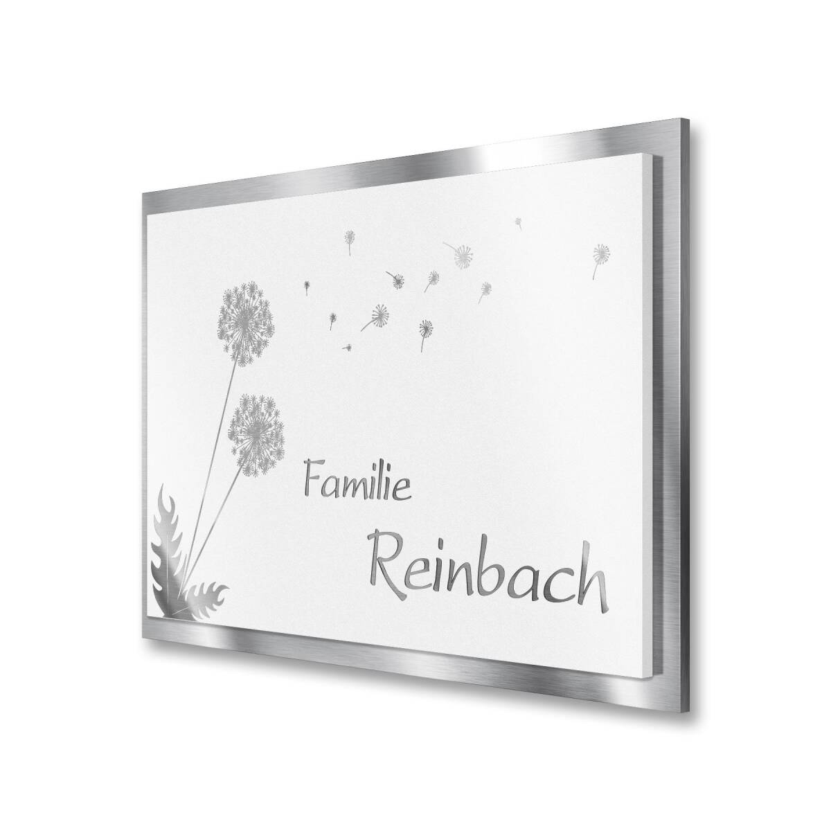 Cette plaque de non est un accroche-regard spécial pour votre entrée spécial. La plaque de base est fabriquée en acier inoxydable V2A est le panneau frontal en verre acrylique en blanc. Ceci rend la plaque de nom extrêmement résistante aux intempéries pendant des années. Pour la gravure laser personnalisée, vous avez le choix parmi plusieurs polices de caractères modernes. L’aigrette de dent-de-lion gravée est surtout impressionnante.