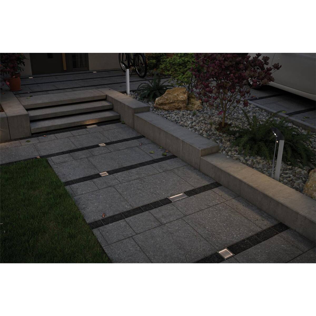 Leuchtende Pflastersteine ganz ohne Kabel: Die Solar-Bodeneinbauleuchte Aron in den Abmessungen 20x10 cm, lässt sich ganz unabhängig vom Stromanschluss verlegen. Tagsüber werden die Akkus durch Sonnenlicht aufgeladen und in der Dämmerung leuchtet ein Orientierungslicht das zum Funktionslicht wird, wenn der Bewegungsmelder Personen in der Nähe wahrnimmt. Da die Solarzellen etwas zurückgesetzt liegen, sind sie nahezu unsichtbar und man nimmt nur eine gleichmäßig leuchtende Fläche wahr. Die Bodeneinbauleuchte ist dank Schutzart IP67 garantiert wasserdicht, rostfrei und für den Einbau in begehbaren Außenbereichen geeignet - bis zu 500kg Gewicht steckt die Leuchte locker weg.
