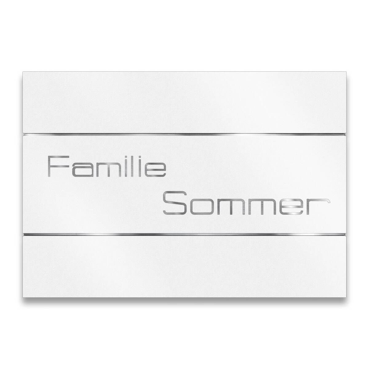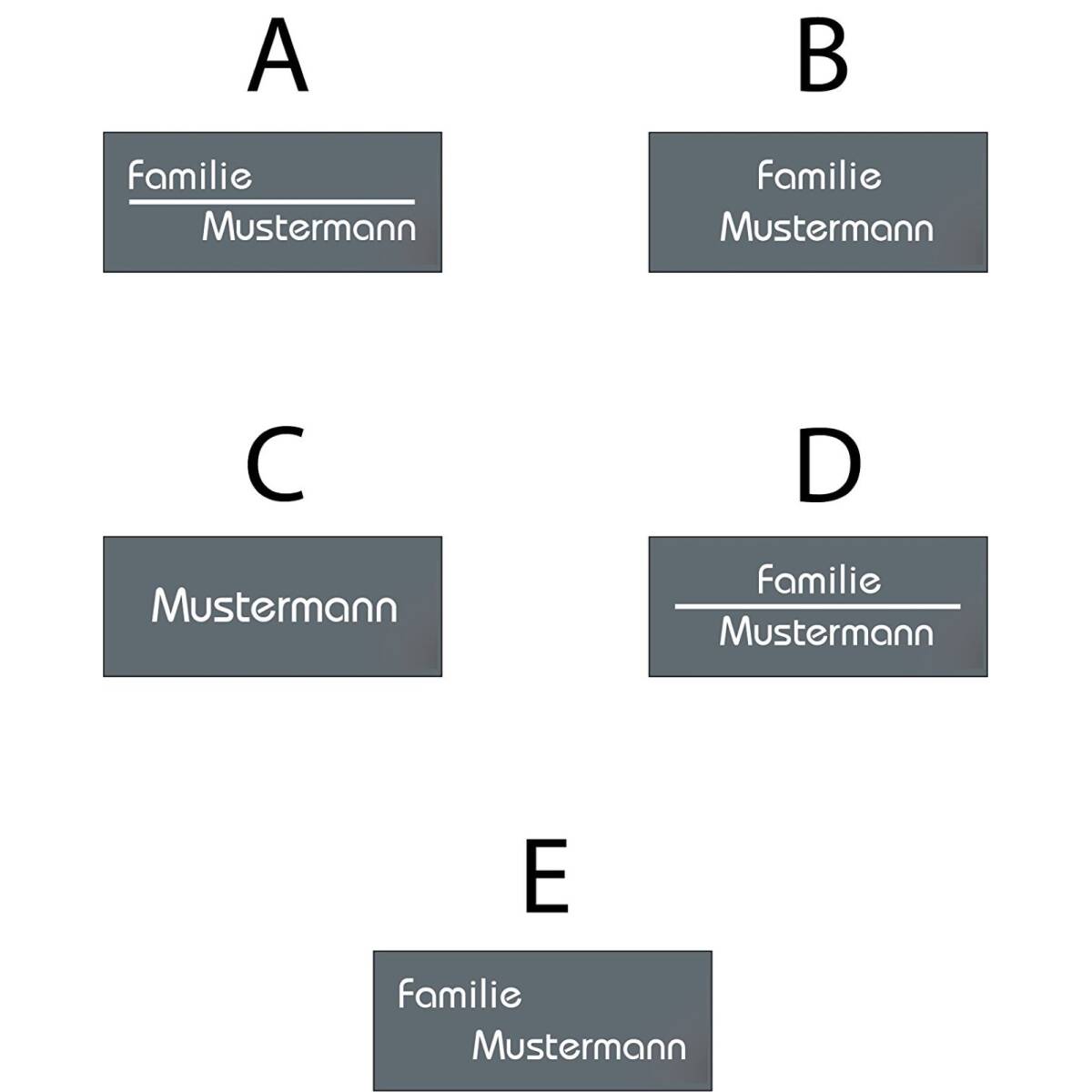 La targhetta è realizzata in acciaio inox V2A inossidabile e acrilico antigraffio in bianco. Questo rende la targhetta nome estremamente resistente agli agenti atmosferici e durevole per molti anni. Come punto forte, hai a disposizione due righe per l’incisione laser del tuo nome. Il vantaggio dell’incisione laser è che è permanentemente resistente e non sbiadisce. Puoi scegliere tra numerosi font moderni.
