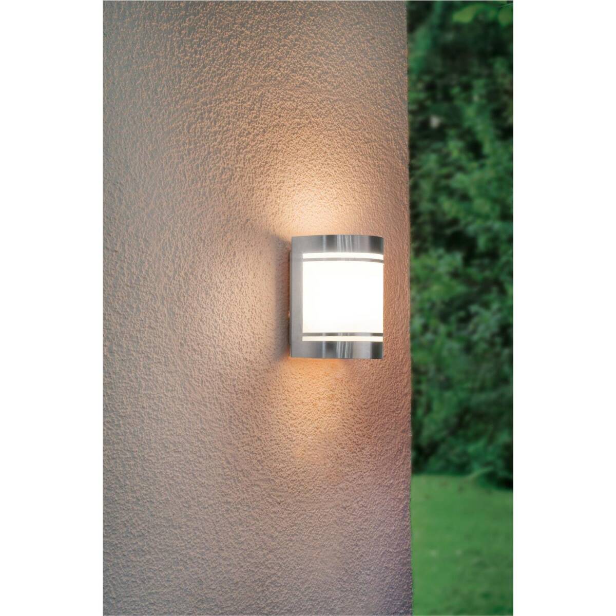 Die Außen-Wandleuchte CERNO wurde aus einem gewölbten Edelstahl-Körper und einer weiß satinierten Leuchtfläche aus Glas gefertigt. Aufgrund des Spritzwasserschutzes (IP44) kann sie bedenkenlosen in Außenbereichen verwendet werden. Egal ob Hauseingang, Terrasse oder Balkon, dank des zeitlosen Designs fügt sich die Leuchte in verschiedenste Outdoor-Bereiche ein und erhellt diese sicher, zuverlässig und blendfrei. Das Leuchtmittel ist nicht im Lieferumfang enthalten. Für die Leuchte eignen sich alle Leuchtmittel mit E27-Sockel.